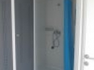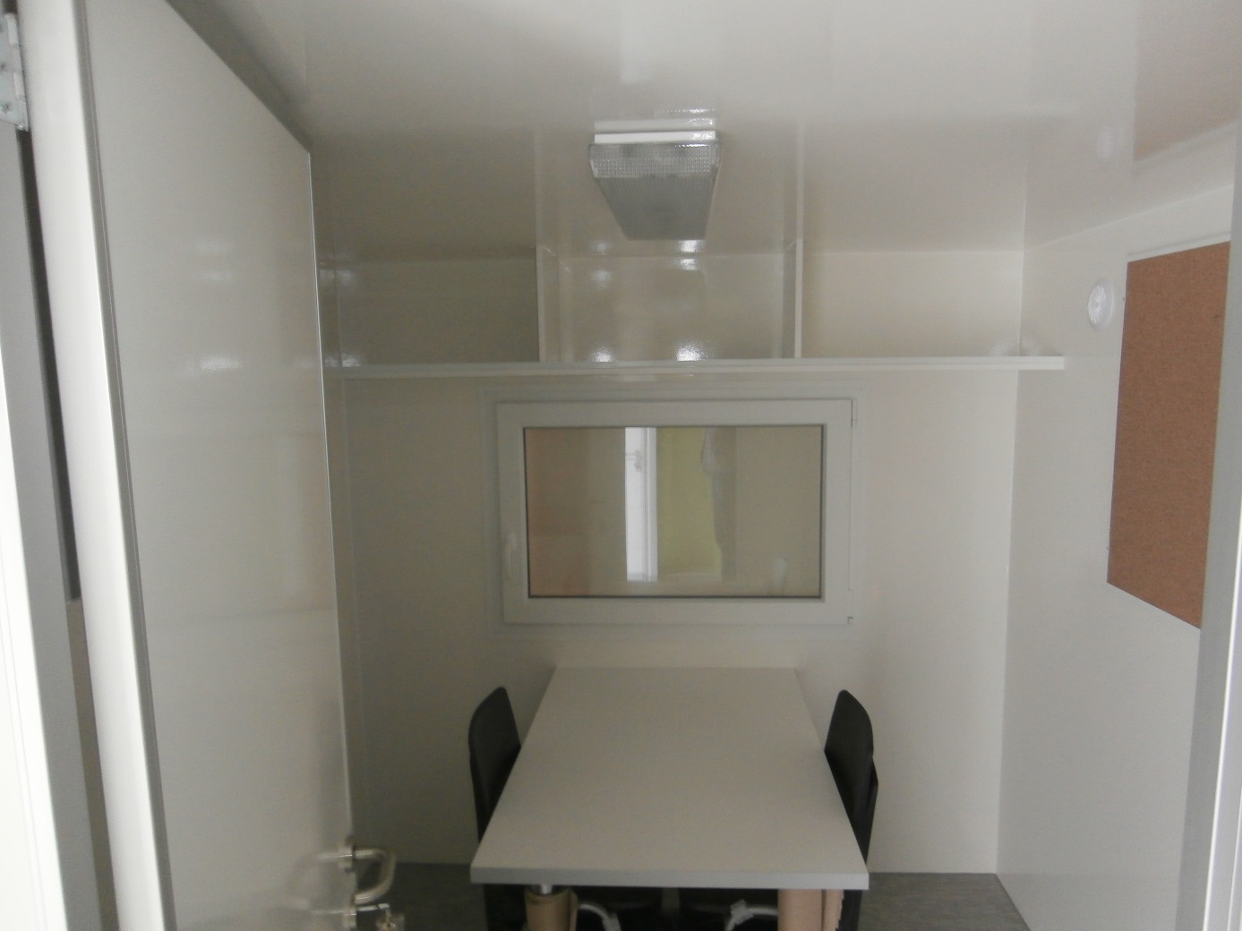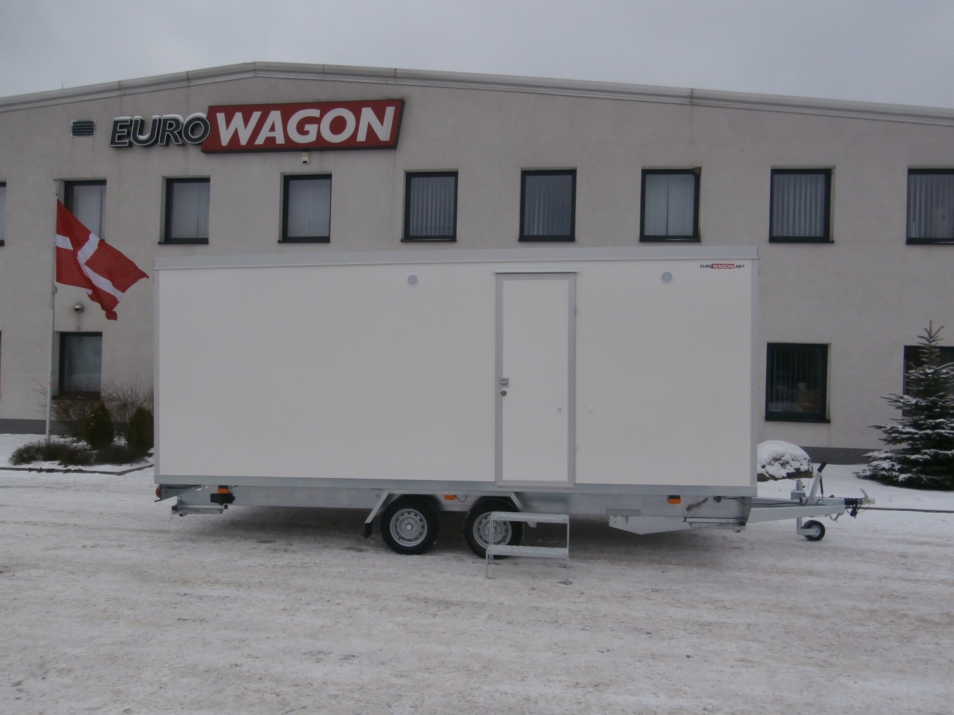 Elektrisch beheizte Wagen für vier Personen, ausgestattet mit Umkleideraum, Büro/Speiseraum mit Kühlschrank, Badezimmer mit Toilette, Dusche und Waschbecken mit Spiegel.
