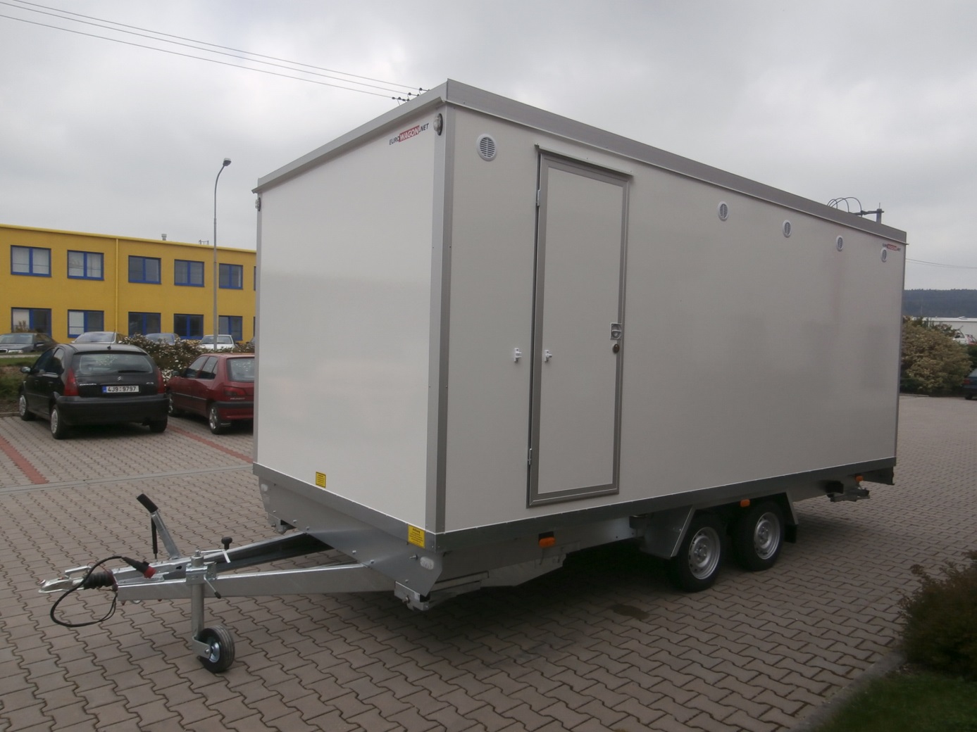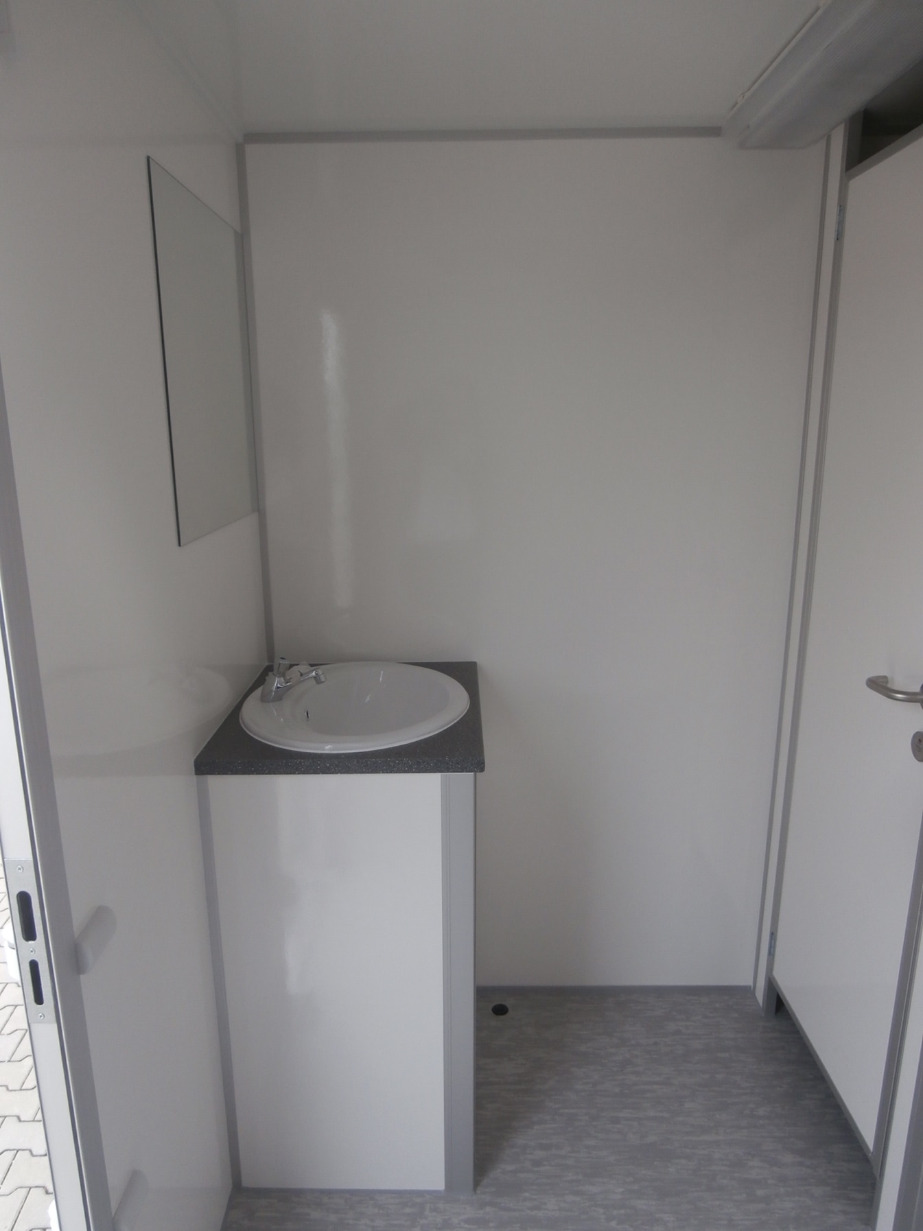 Elektrisch beheizte Toilettenwagen mit drei einzelnen Toilettenkabinen bei Damen, eine Toilettenkabine bei Herren + drei Urinale. Beide Abteilungen sind mit Waschbecken und Spiegel ausgestattet.