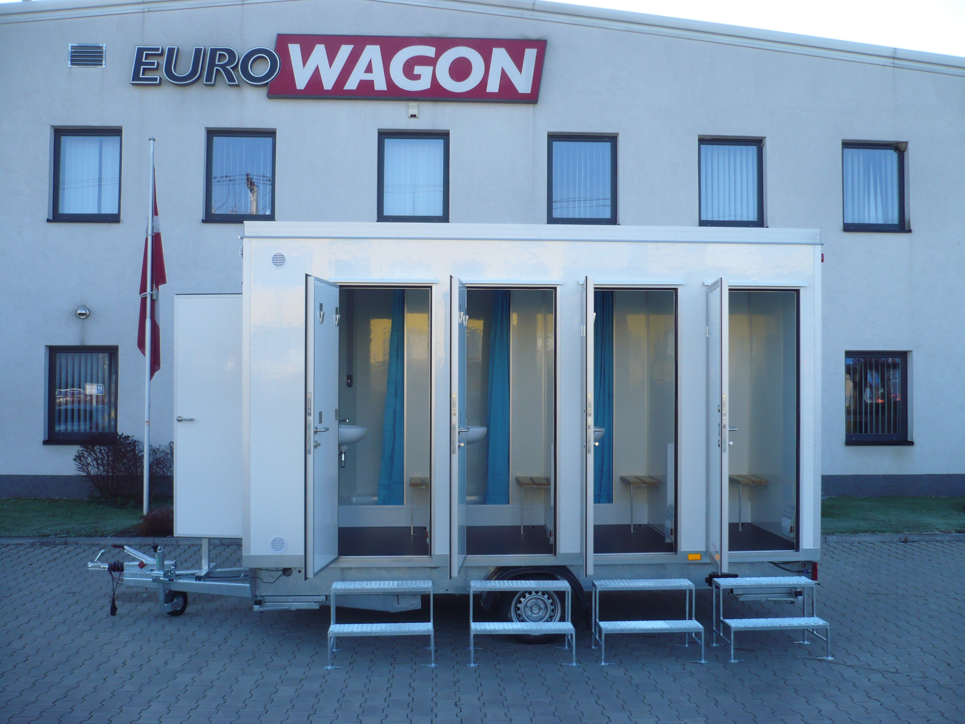 Elektricky vytápěná sanitární mobilní buňka vybavená čtyřmi samostatnými sprchami a umyvadly včetně zrcadel.