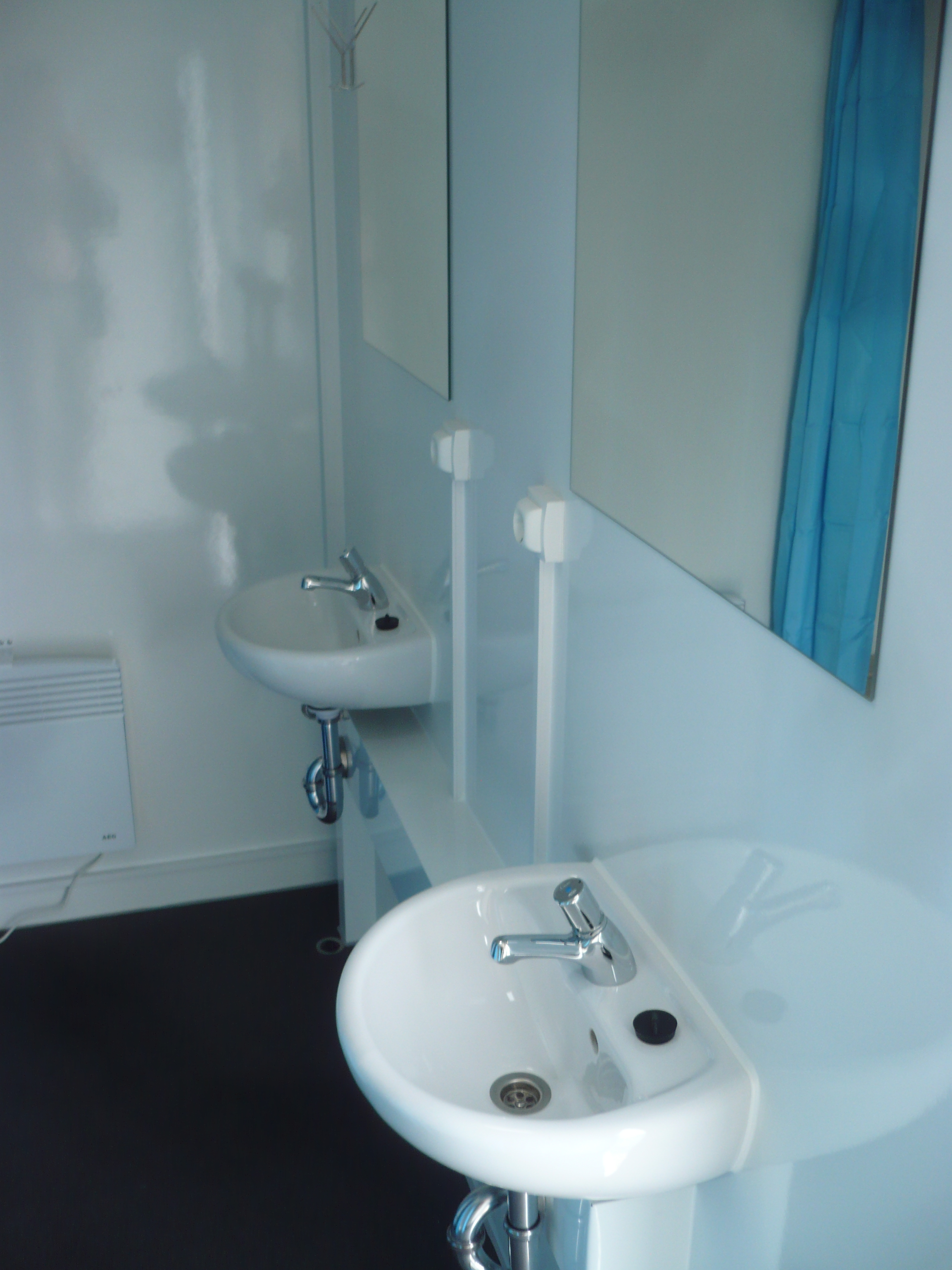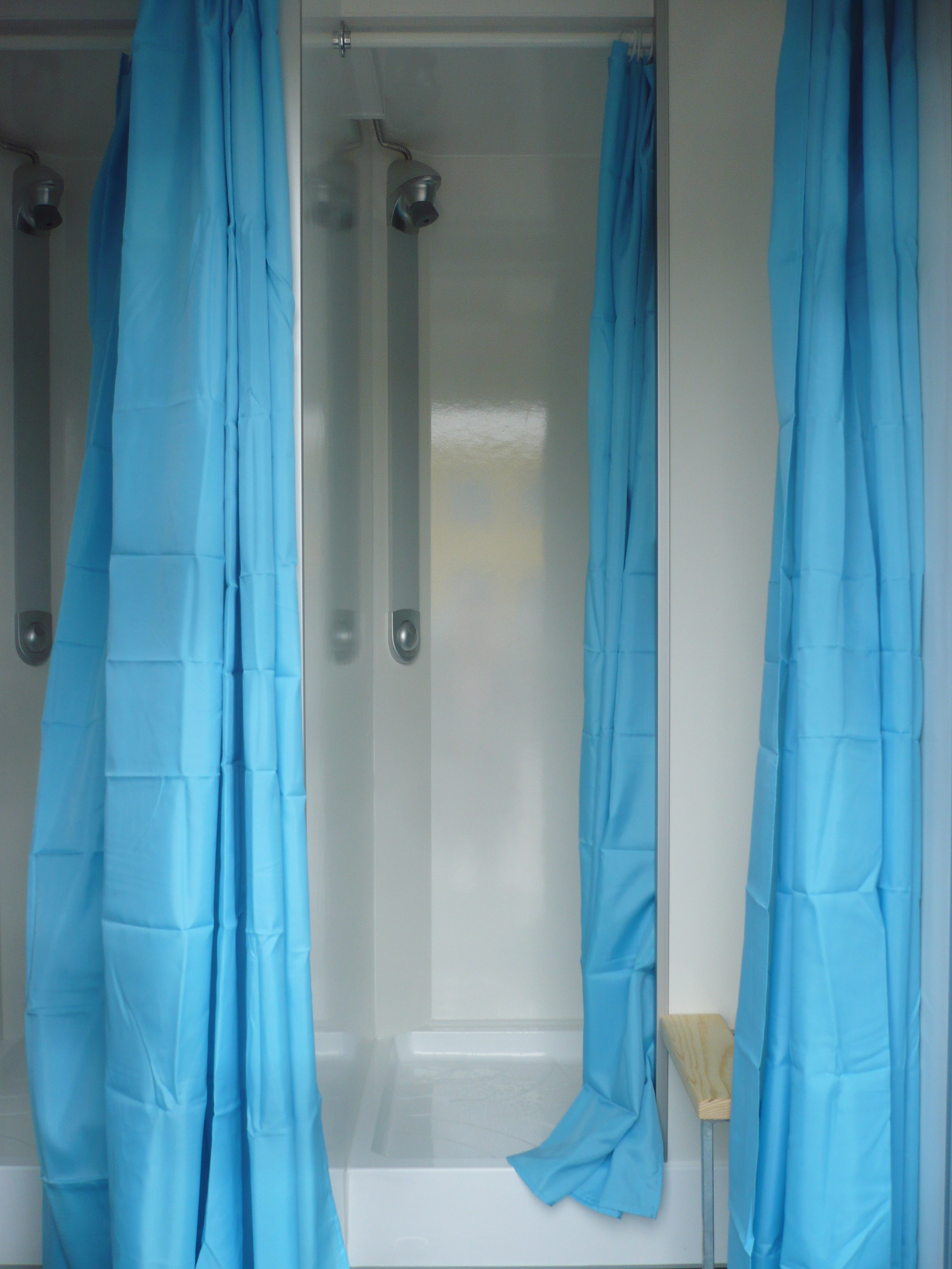 Sanitární mobilní buňka vybavená osmi samostatnými sprchami a společnými umyvadly včetně zrcadel.