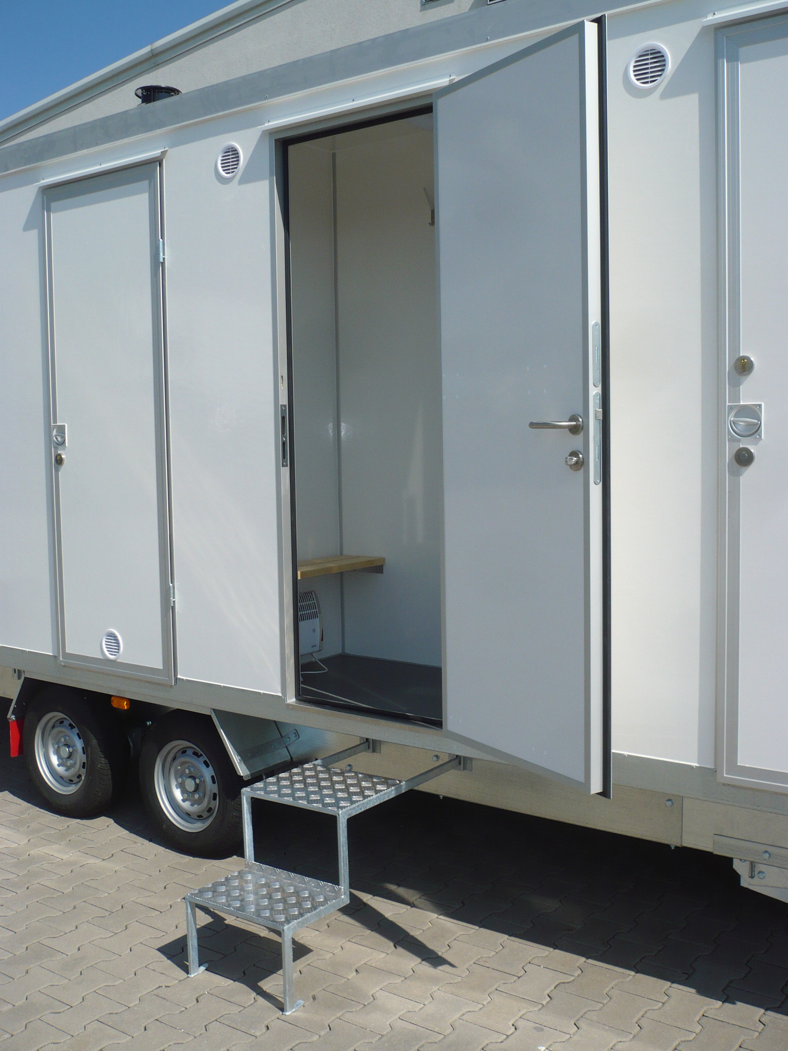 Sanitární mobilní buňka vybavená osmi VIP sprchami se samostatnými vchody.