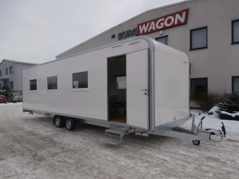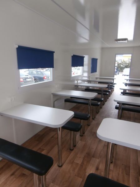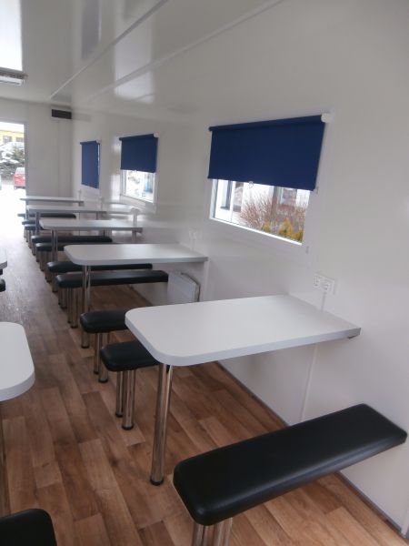 Filmbrancheanhänger - Typ 2470-89. Mobilcafé mit dem angenehmen Interieur und grosser Plätzekapazität. Austattungsteile: Tische, gepolsterte Bänkchen, Steckdosen bei jedem Tisch, Fensterrolladen.