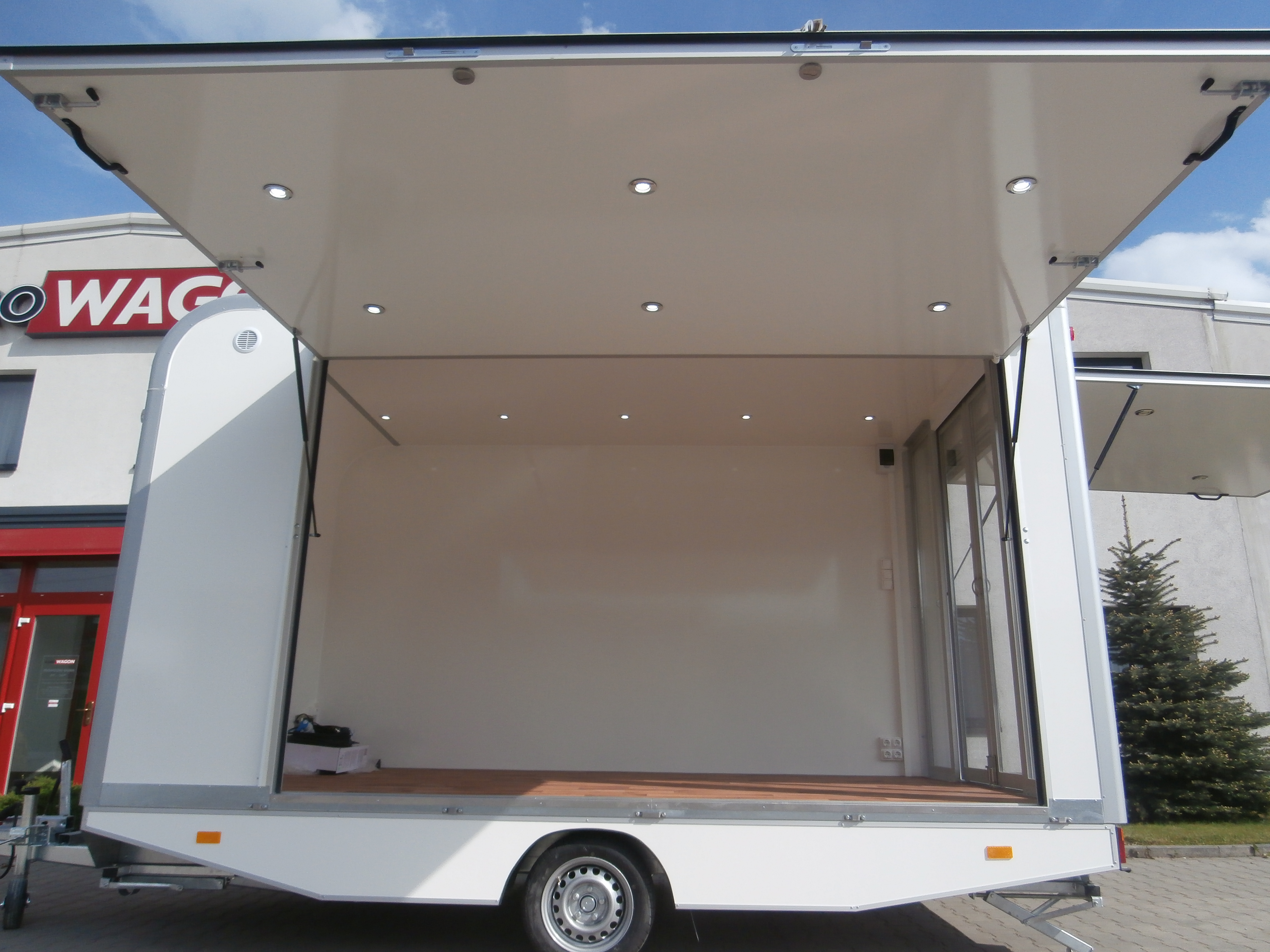 Výstavní mobilní buňka vybavená jedním výklopem.