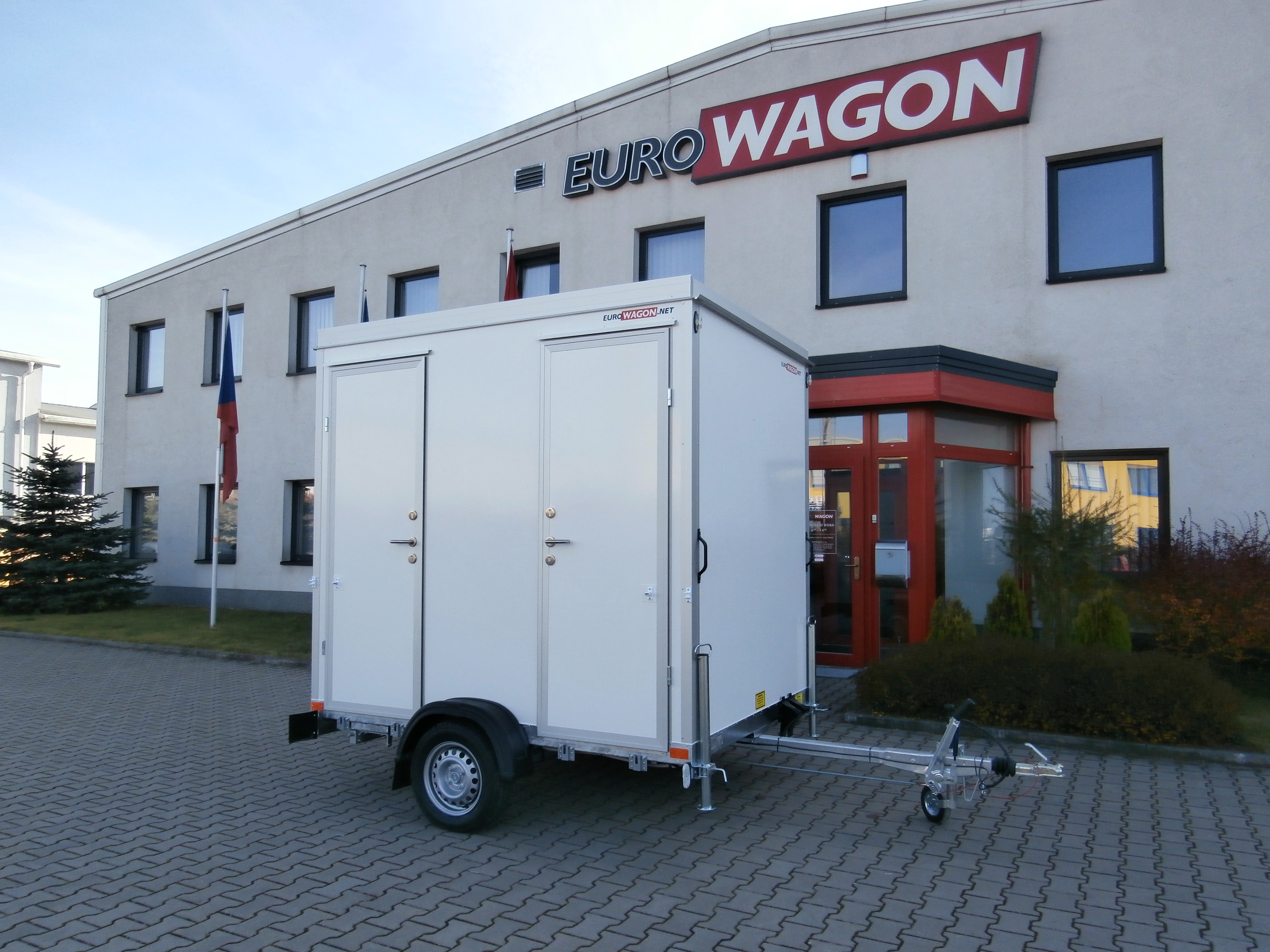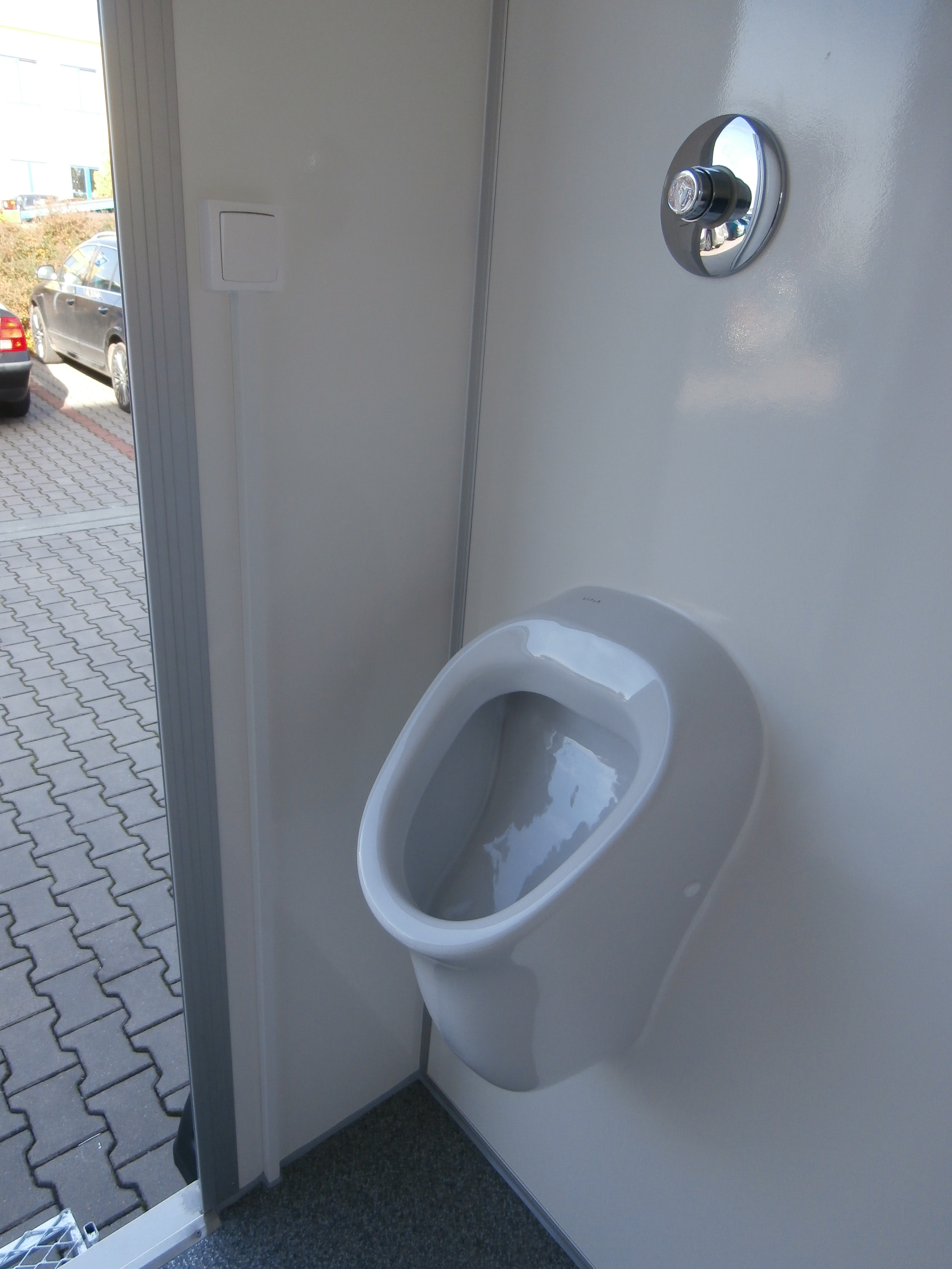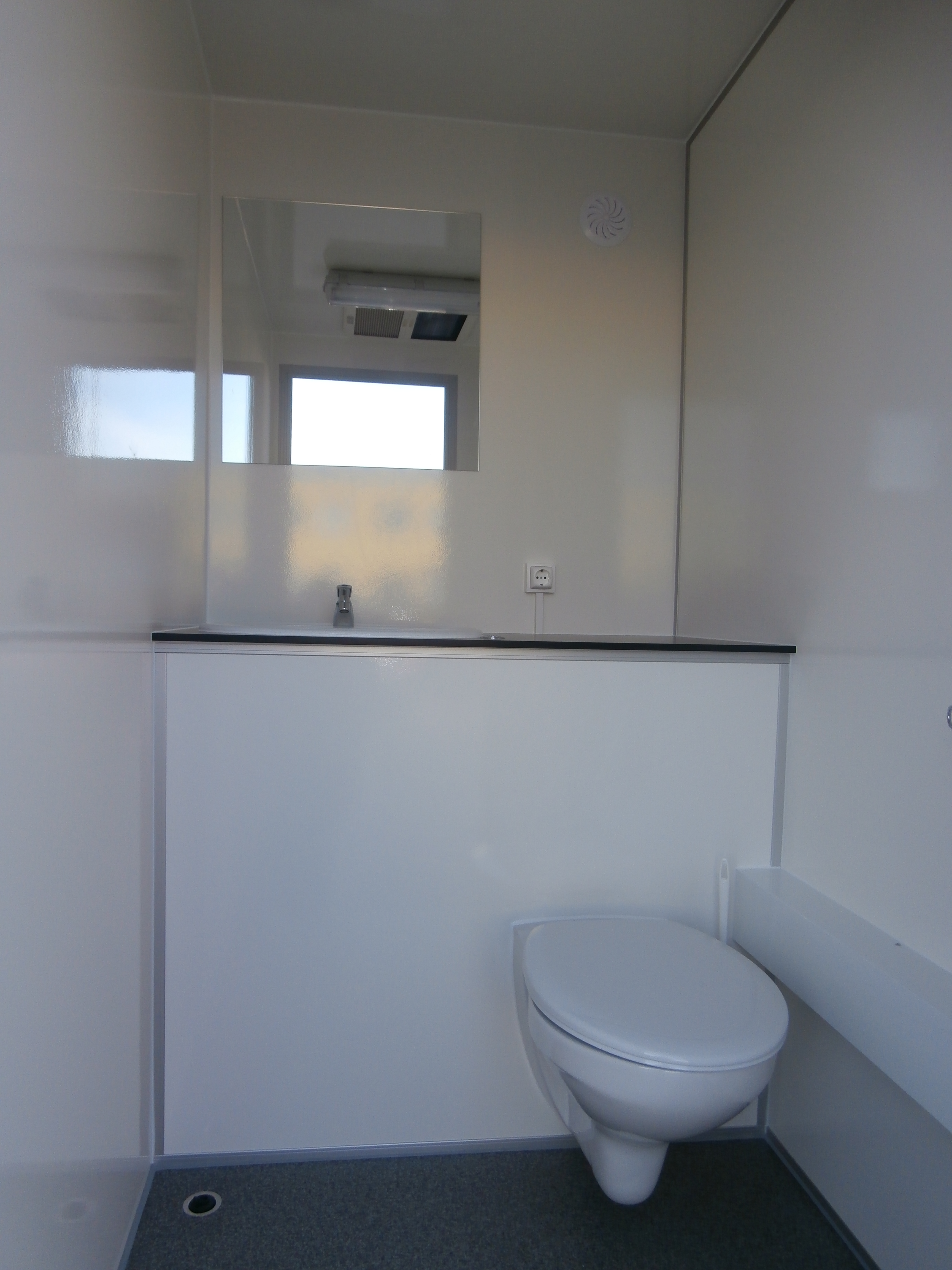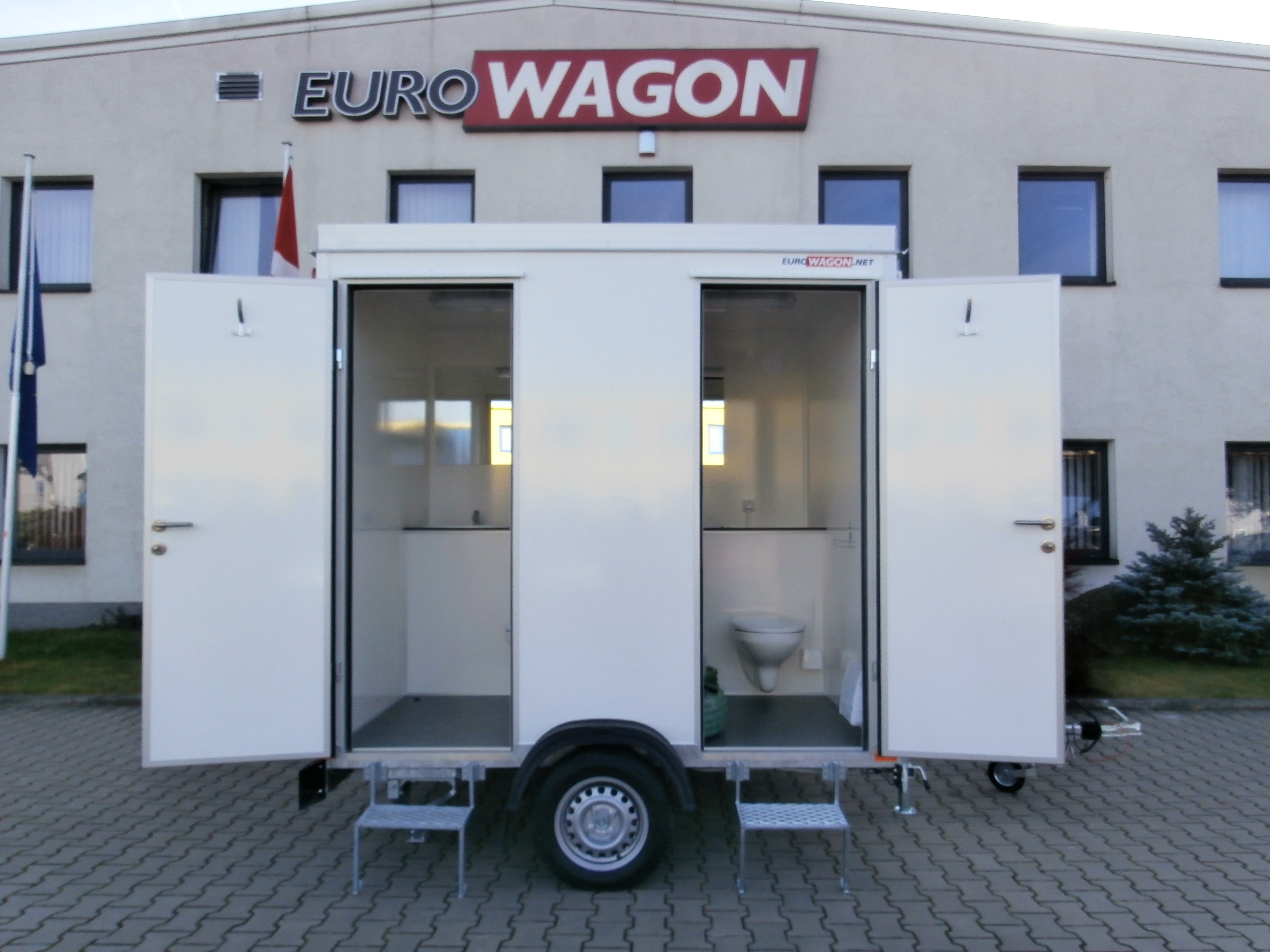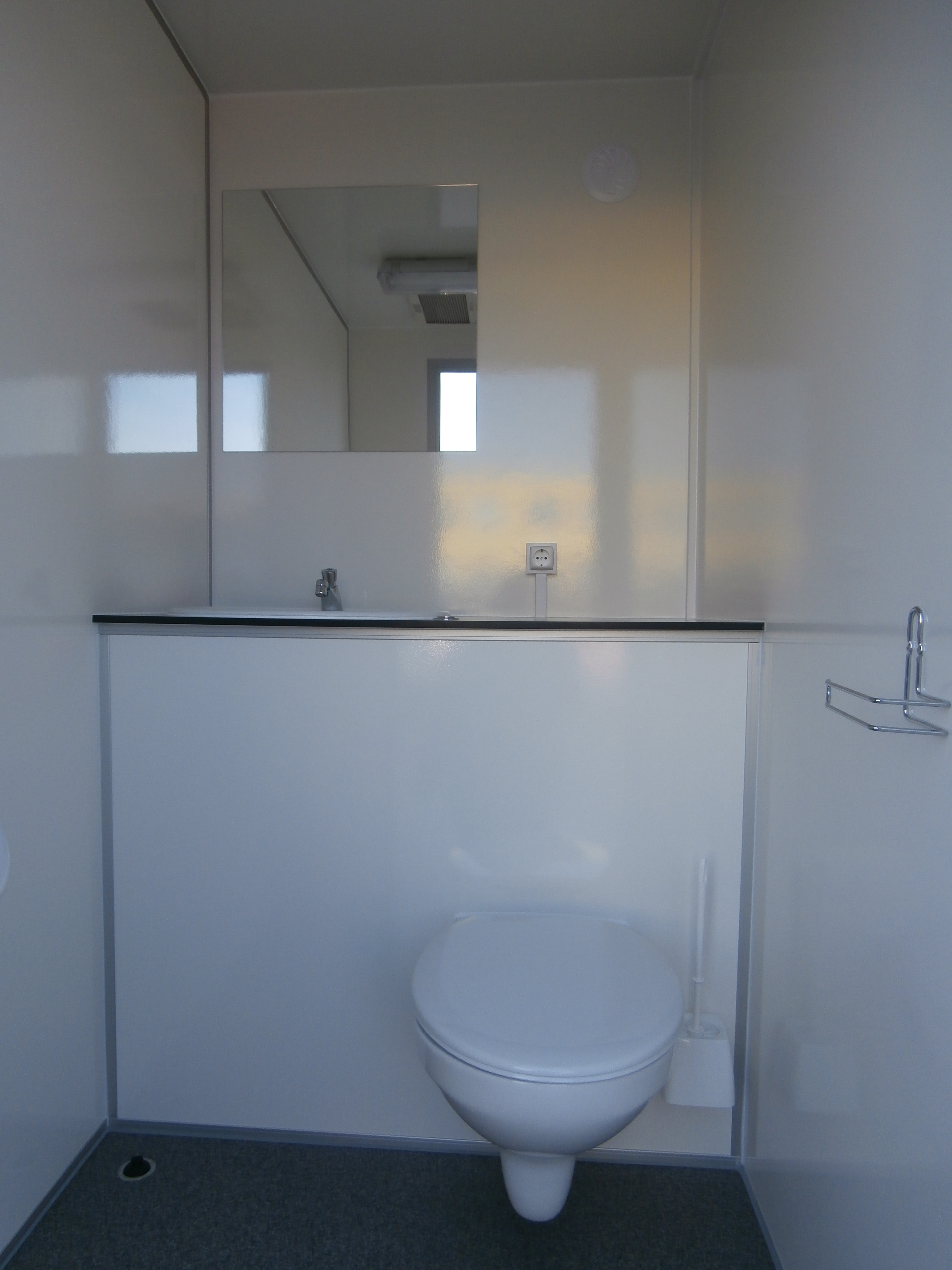 Dva samostatné elektricky vytápěné mobilní záchody + 1 pisoár, WC jsou vybavené umyvadly včetně zrcadel.