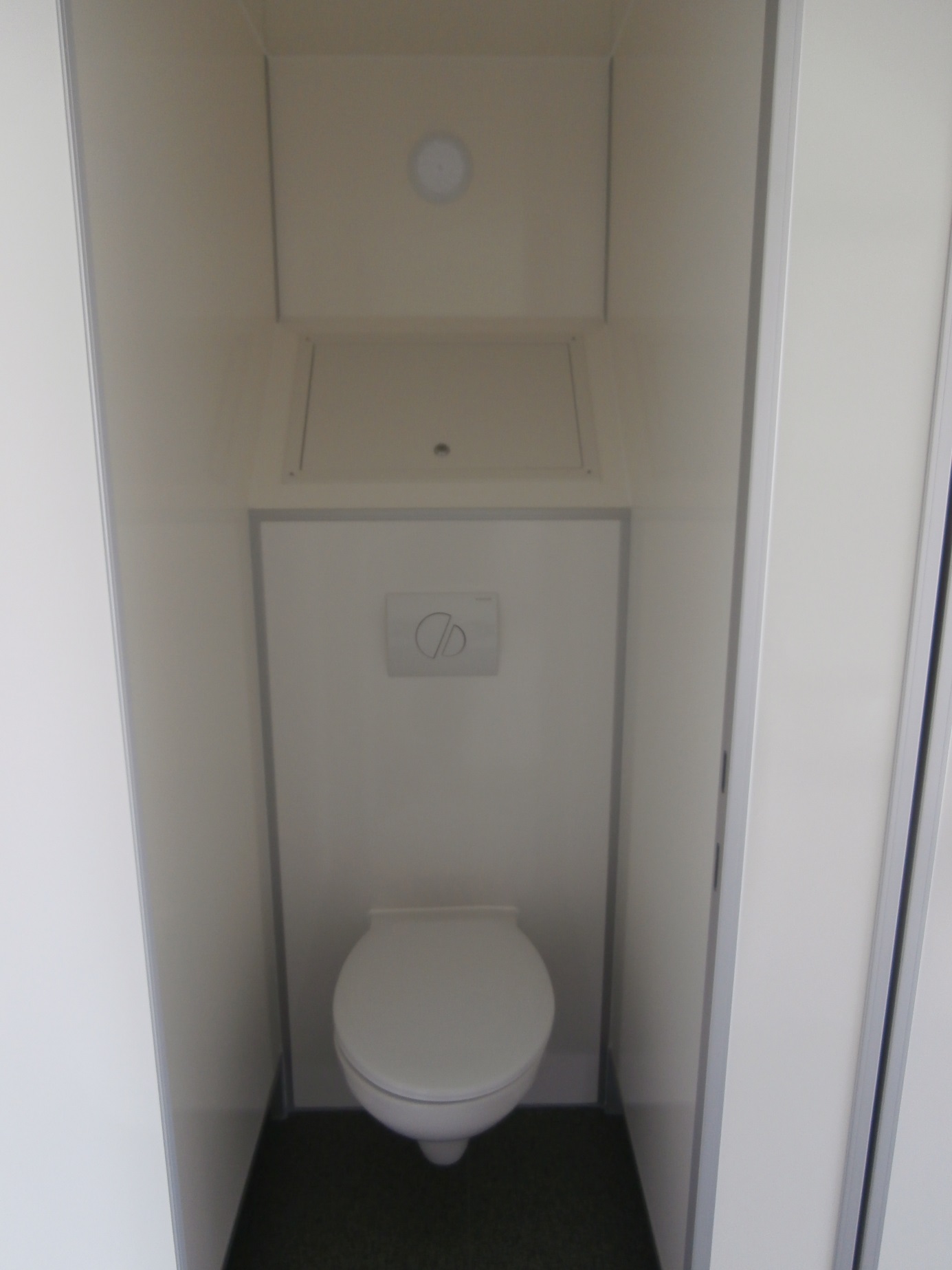 Elektricky vytápěná sanitární mobilní buňka vybavená deseti toaletami a umyvadly včetně zrcadel.