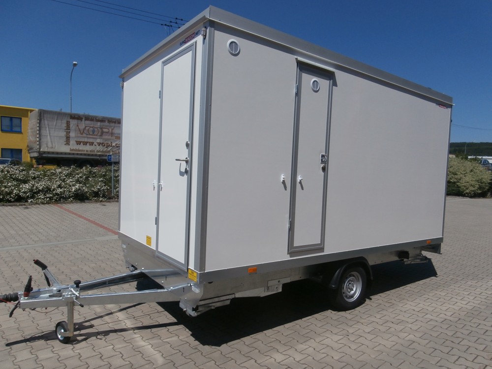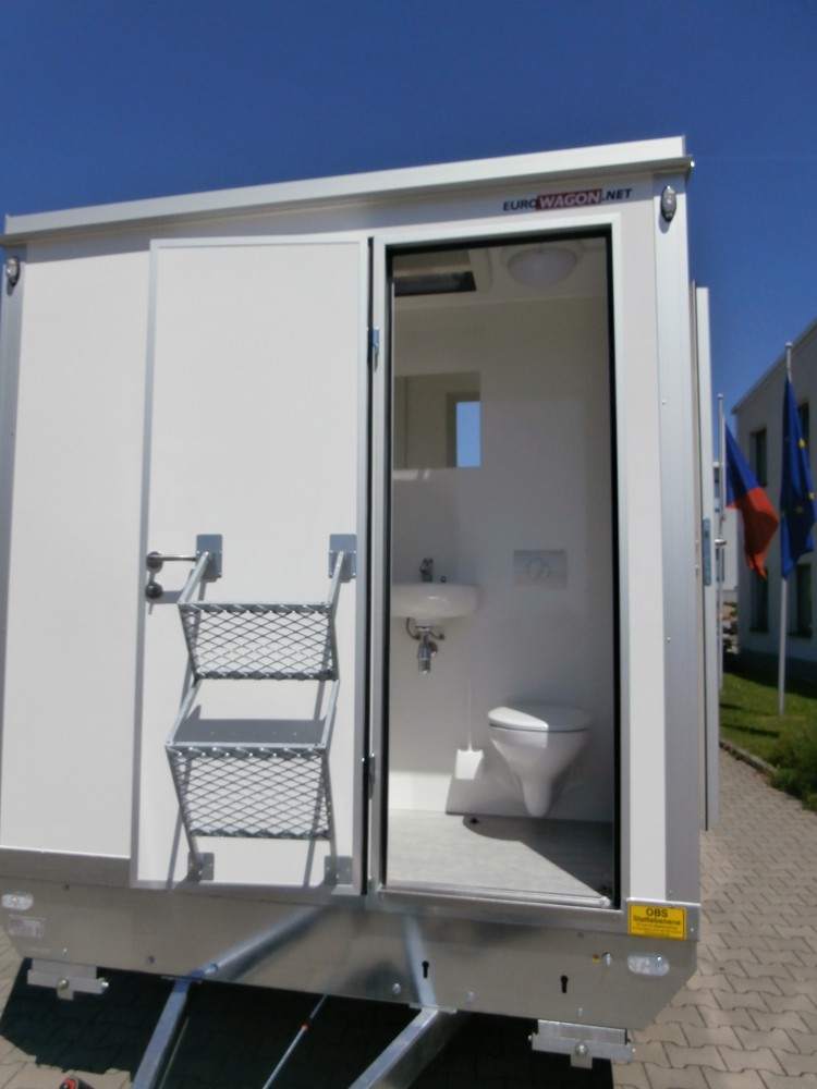 Elektricky vytápěná mobilní buňka pro 6 - 8 osob – vybavená kanceláří/jídelnou s lednicí, toaletou a umyvadlem včetně zrcadla.