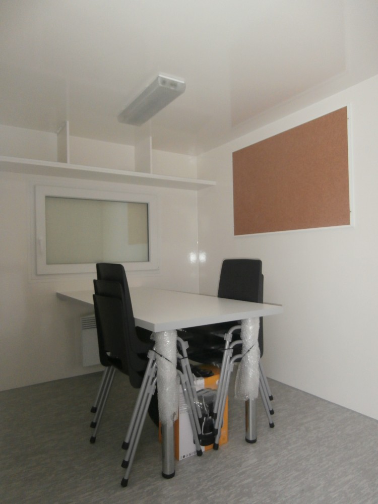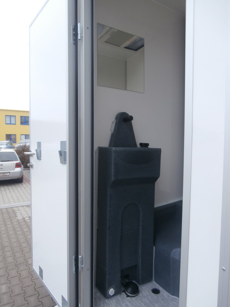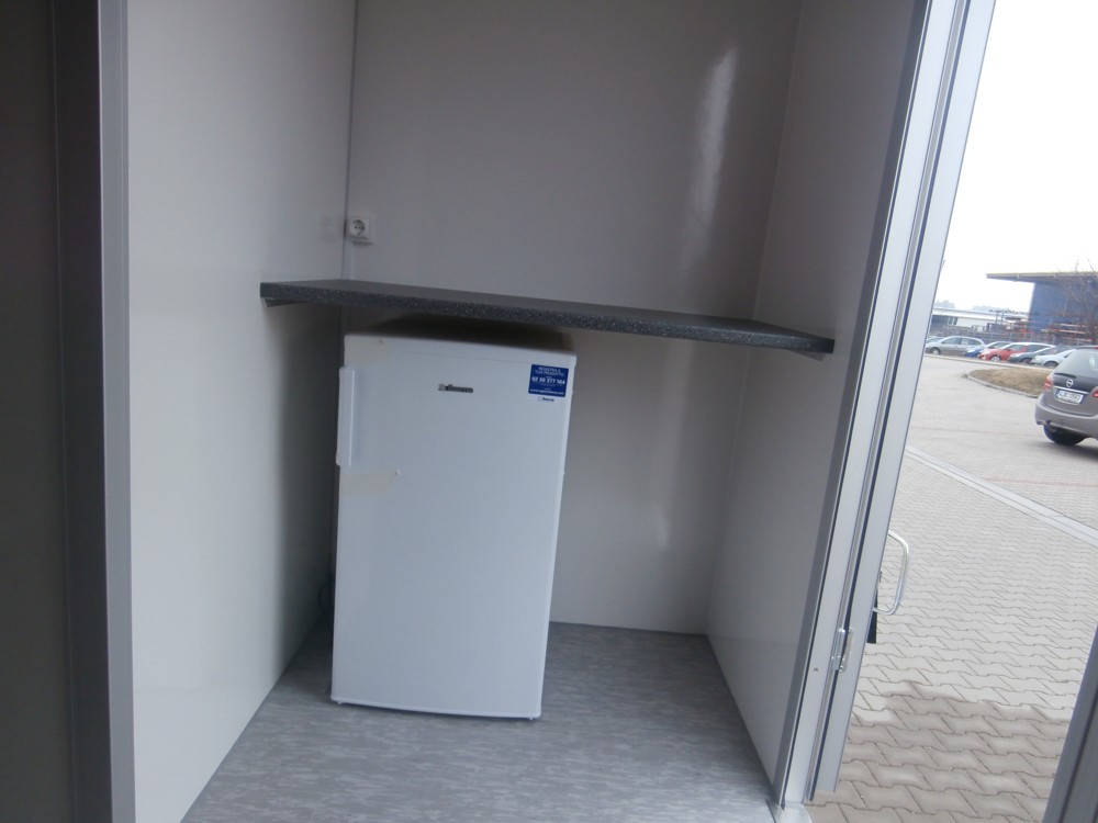 Elektricky vytápěná mobilní buňka pro 6-8 osob – vybavená kanceláří/jídelnou s lednicí, chemickým WC a umyvadlem včetně zrcadla.