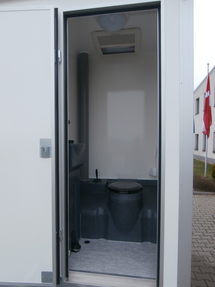 Elektricky vytápěná mobilní buňka pro 10-12 osob – vybavená kanceláří/jídelnou s lednicí, chemickým WC a umyvadlem včetně zrcadla.