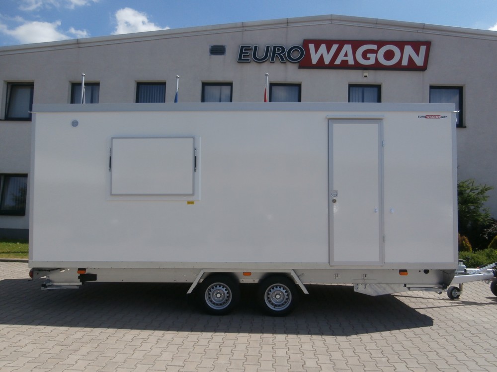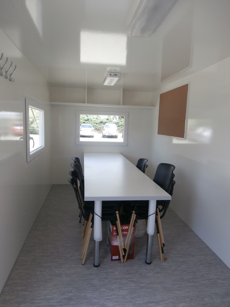 Elektricky vytápěná mobilní buňka pro 10-12 osob – vybavená kanceláří/jídelnou s lednicí, policemi, chemickým WC a umyvadlem včetně zrcadla.