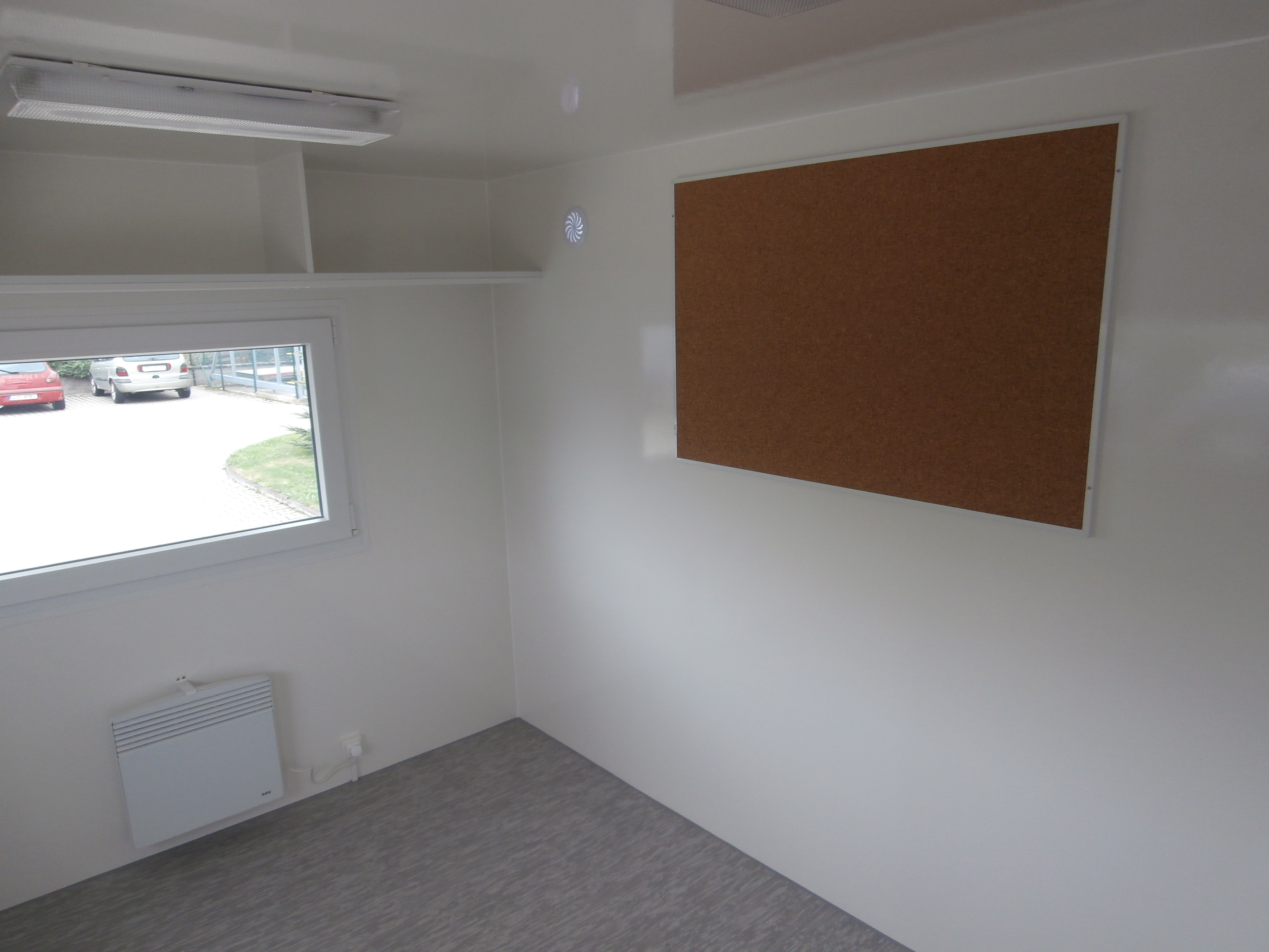 Elektricky vytápěná mobilní buňka vybavená policemi a nástěnkou (bez WC).