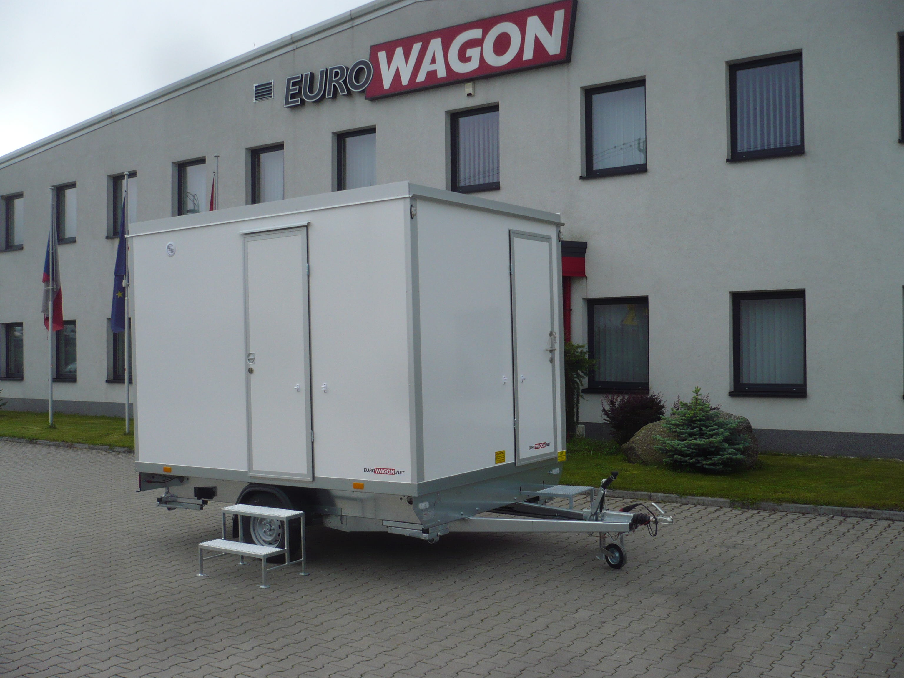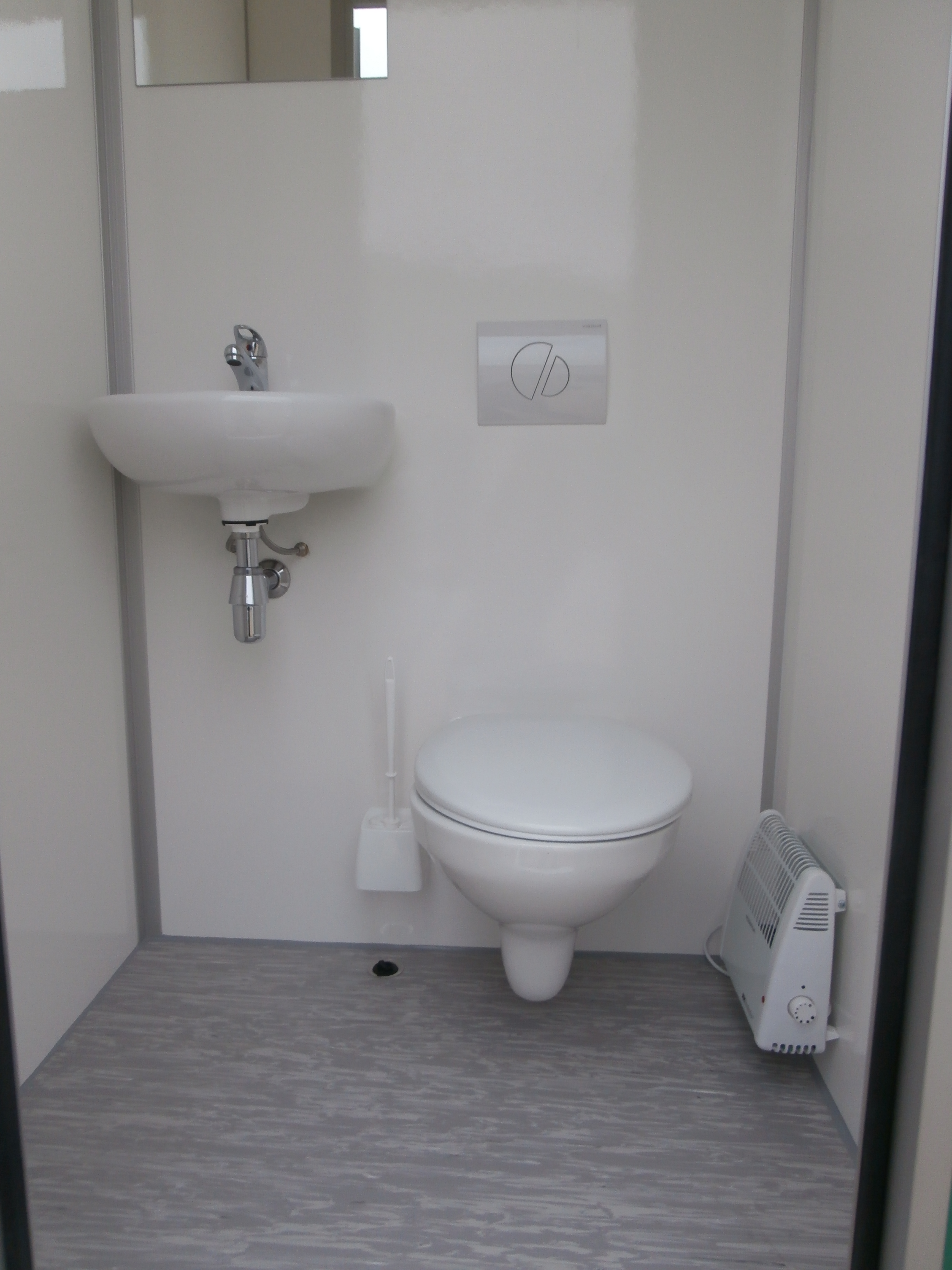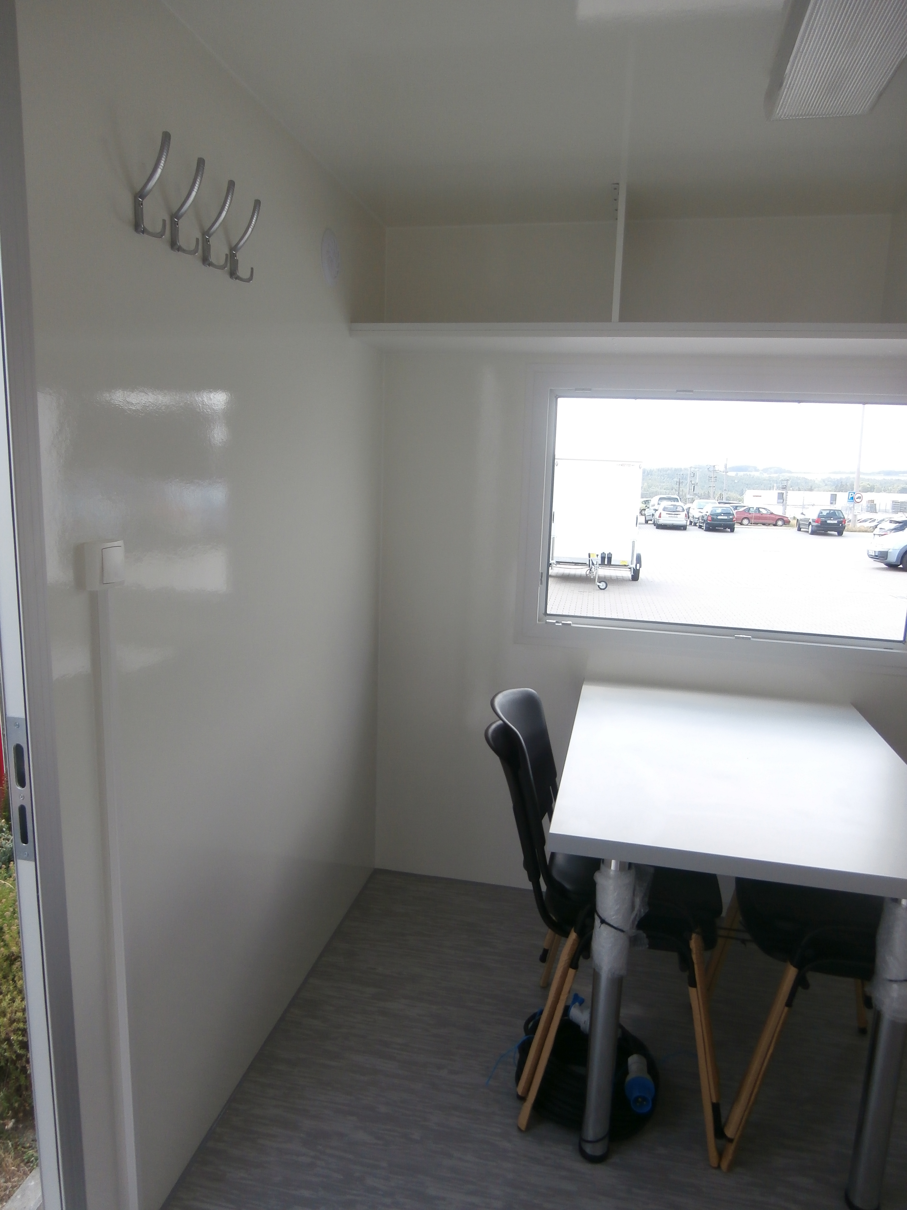 Elektricky vytápěná mobilní buňka pro čtyři osoby – vybavená kanceláří/jídelnou s lednicí, toaletou a umyvadlem včetně zrcadla.