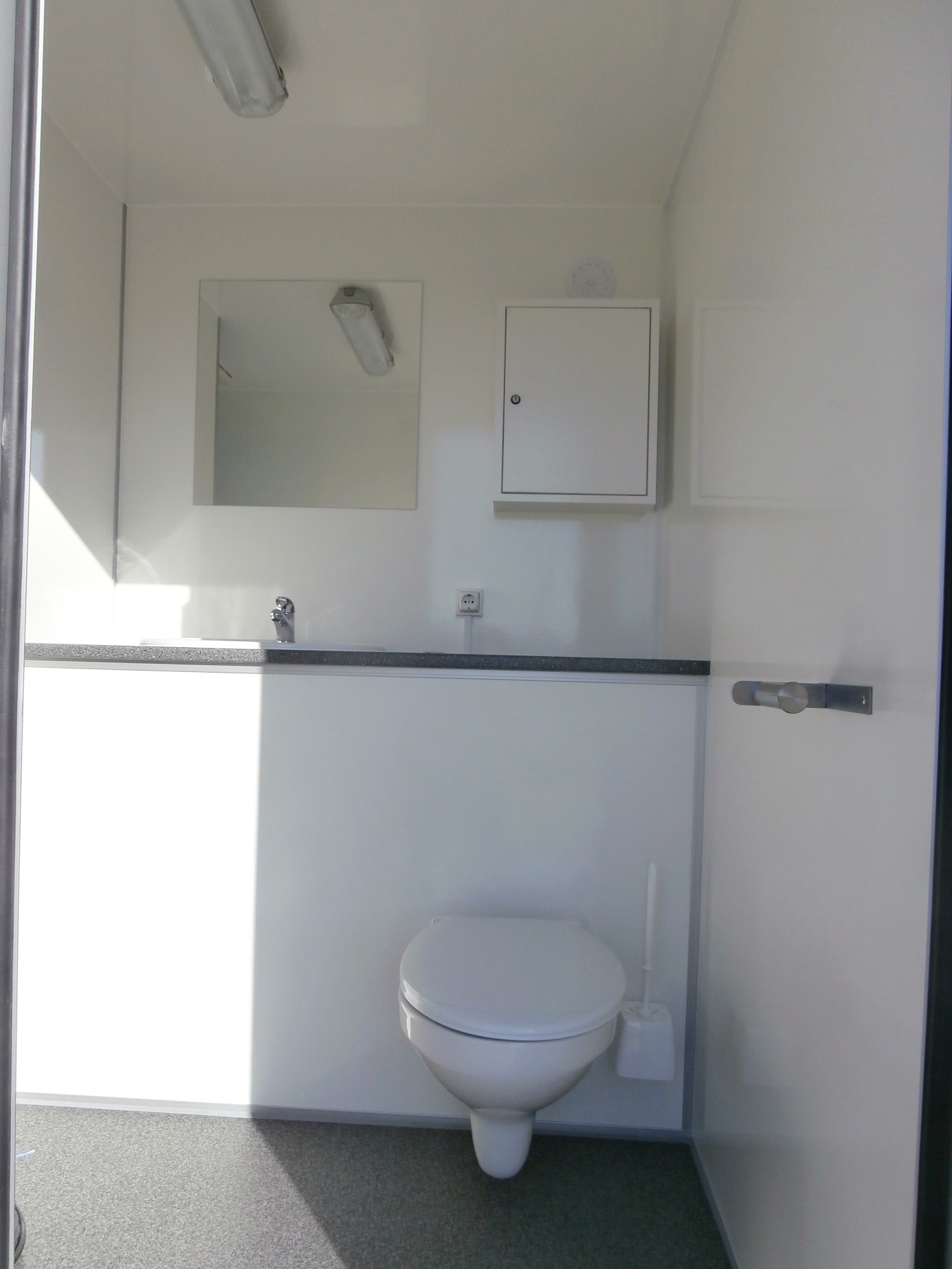 Mobilní koupelna s toaletou, sprchou, umyvadlem včetně zrcadla, skříňkou a elektrickým vytápěním.