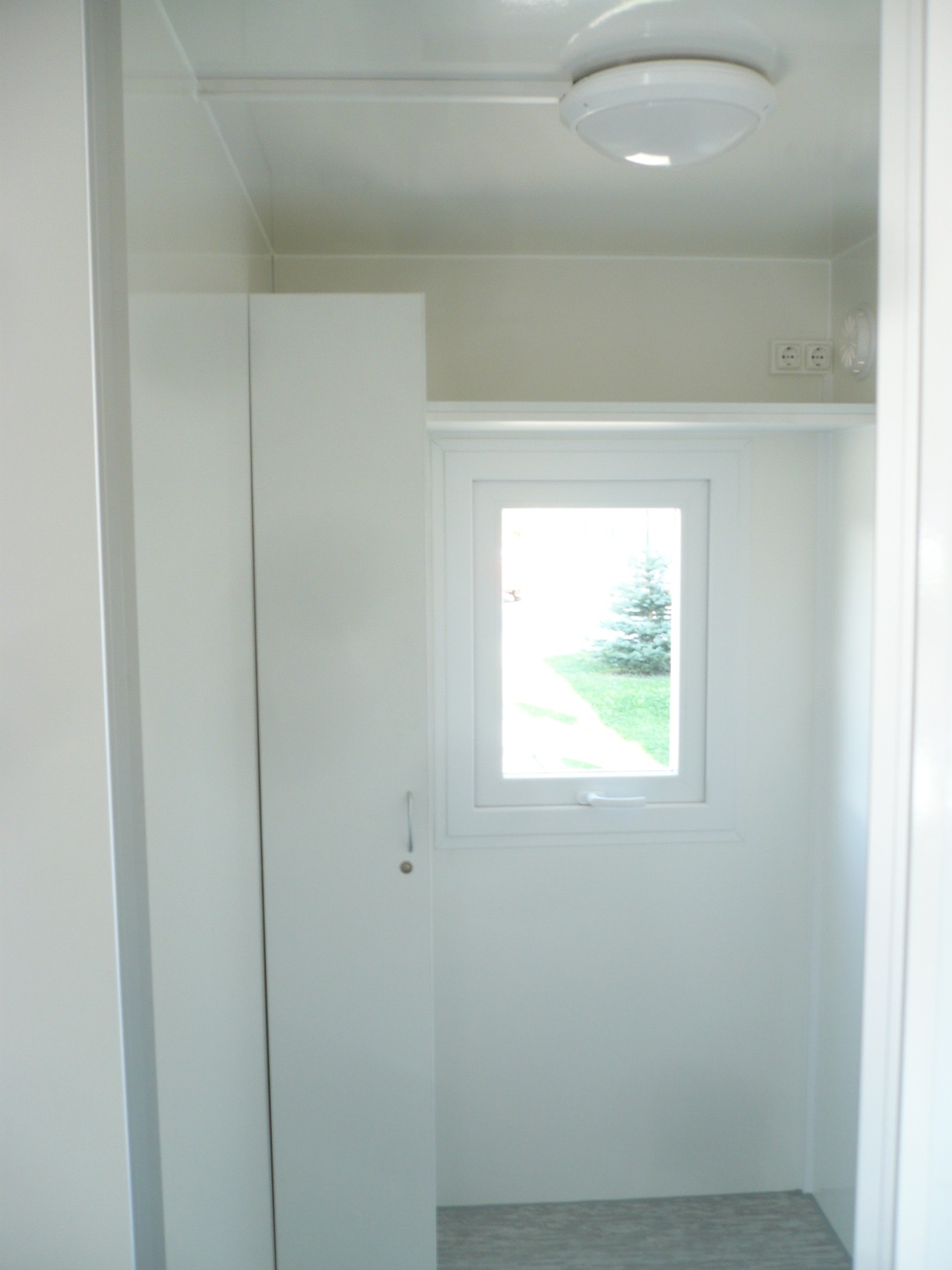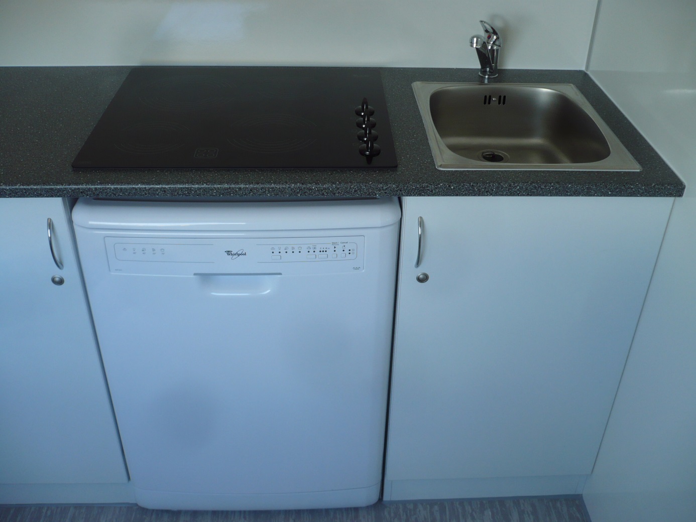 Elektricky vytápěná mobilní obytná buňka pro dvě osoby – vybavená kuchyňkou s příslušenstvím (myčka, odsavač, varná deska, lednice, kávovar, 19" TV), dvěma ložnicemi s postelemi, toaletou, sprchou a umyvadlem včetně zrcadla.
