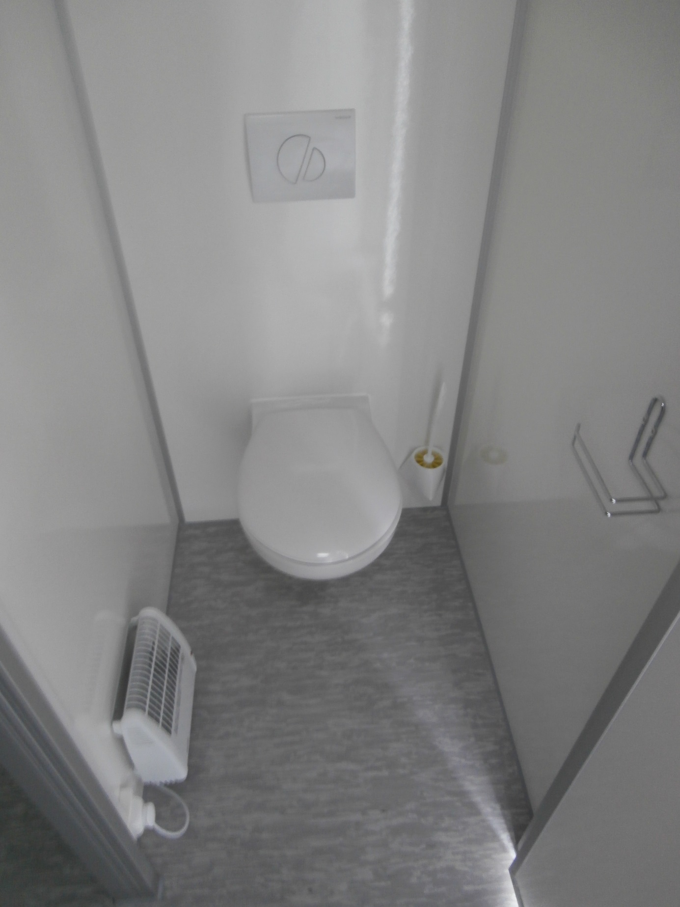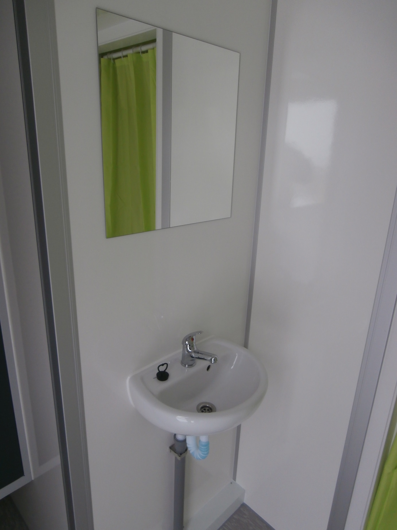 Elektricky vytápěná mobilní buňka pro tři osoby pracující s nebezpečnými látkami – vybavená šatnami, kanceláří/jídelnou s lednicí, toaletou, průchozí sprchou a umyvadly včetně zrcadel.