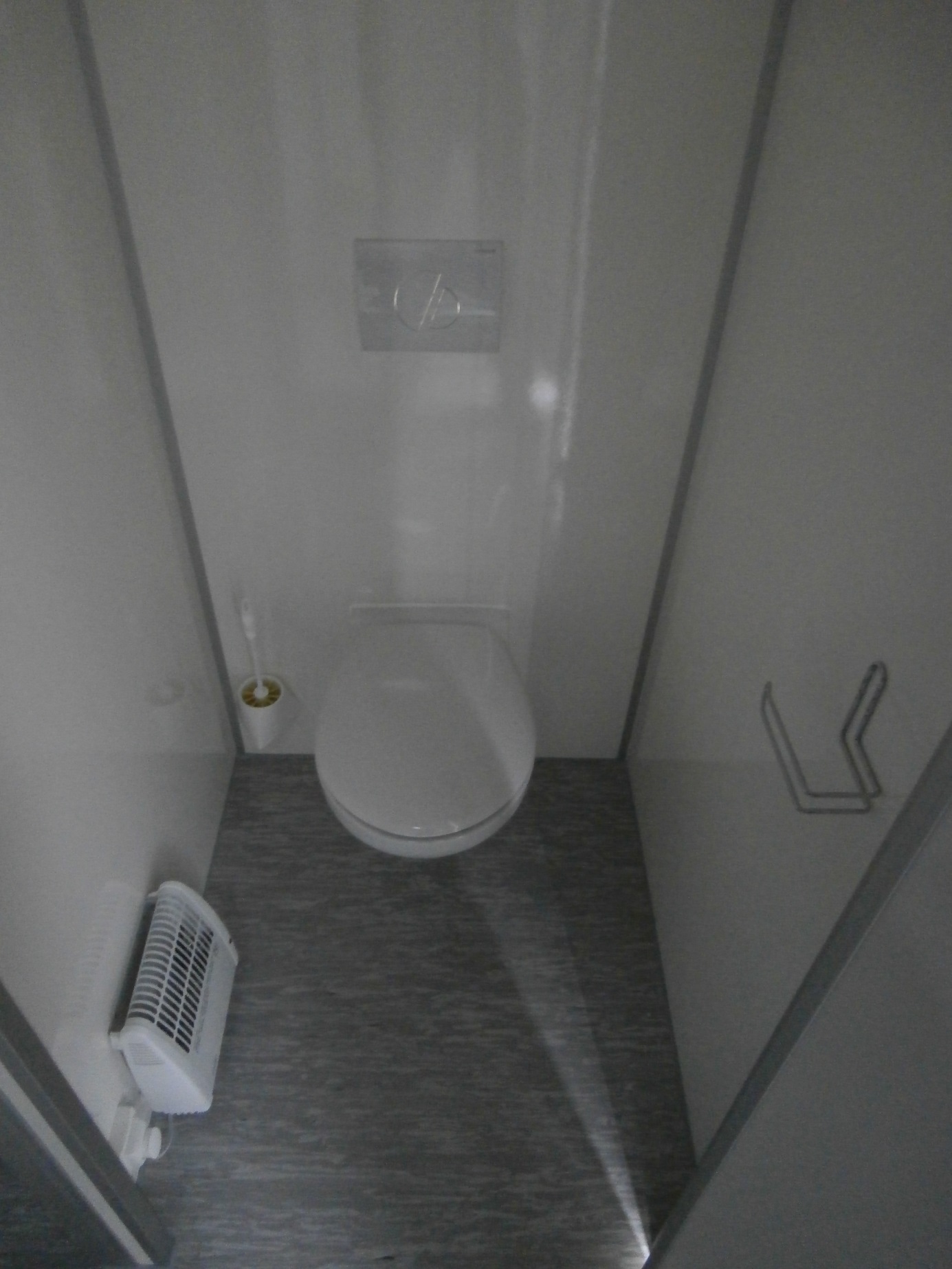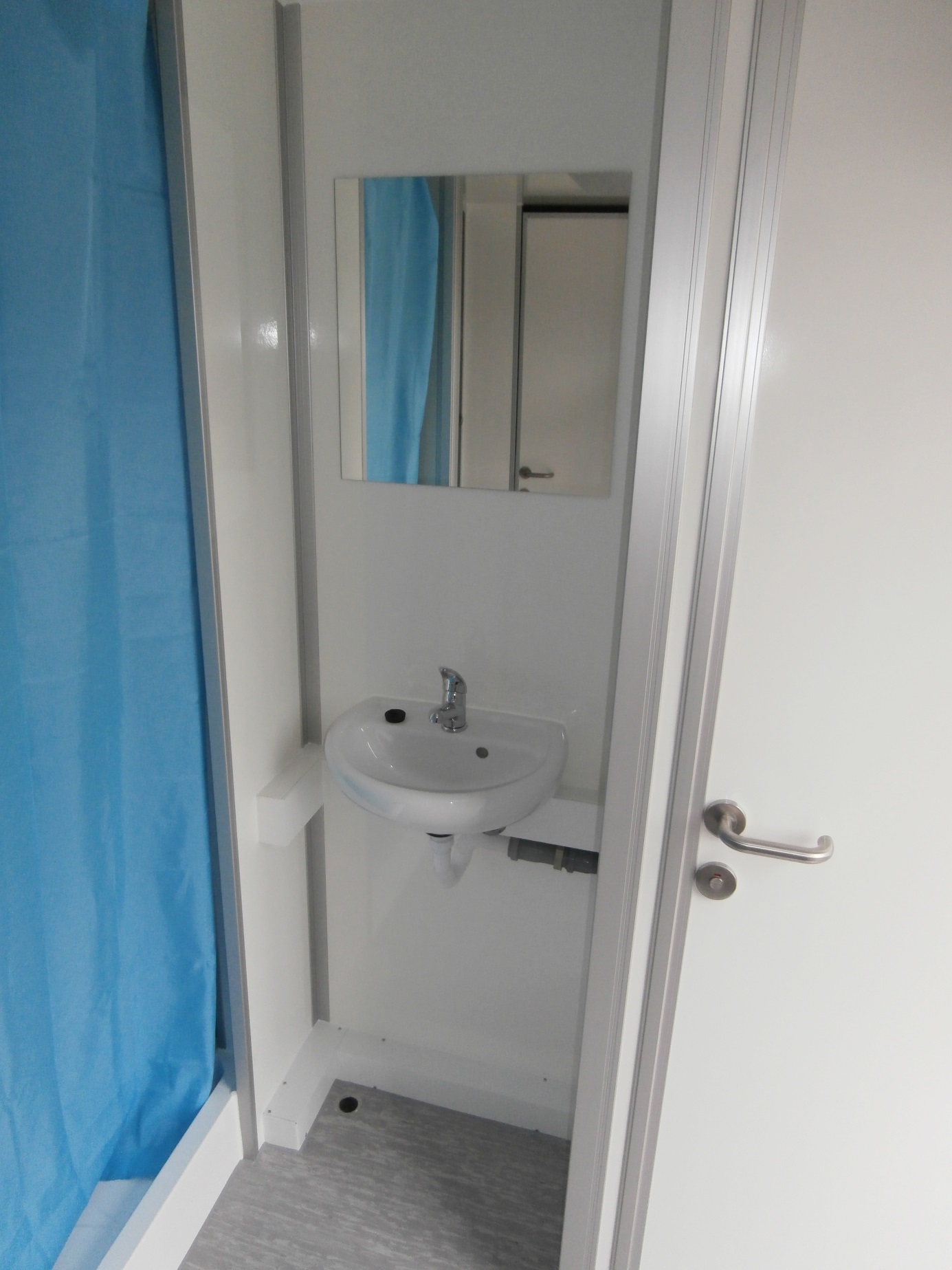 Elektricky vytápěná mobilní buňka pro pět osob pracujících s nebezpečnými látkami – vybavená šatnami, kanceláří/jídelnou s lednicí, toaletou, průchozí sprchou a umyvadly včetně zrcadel.