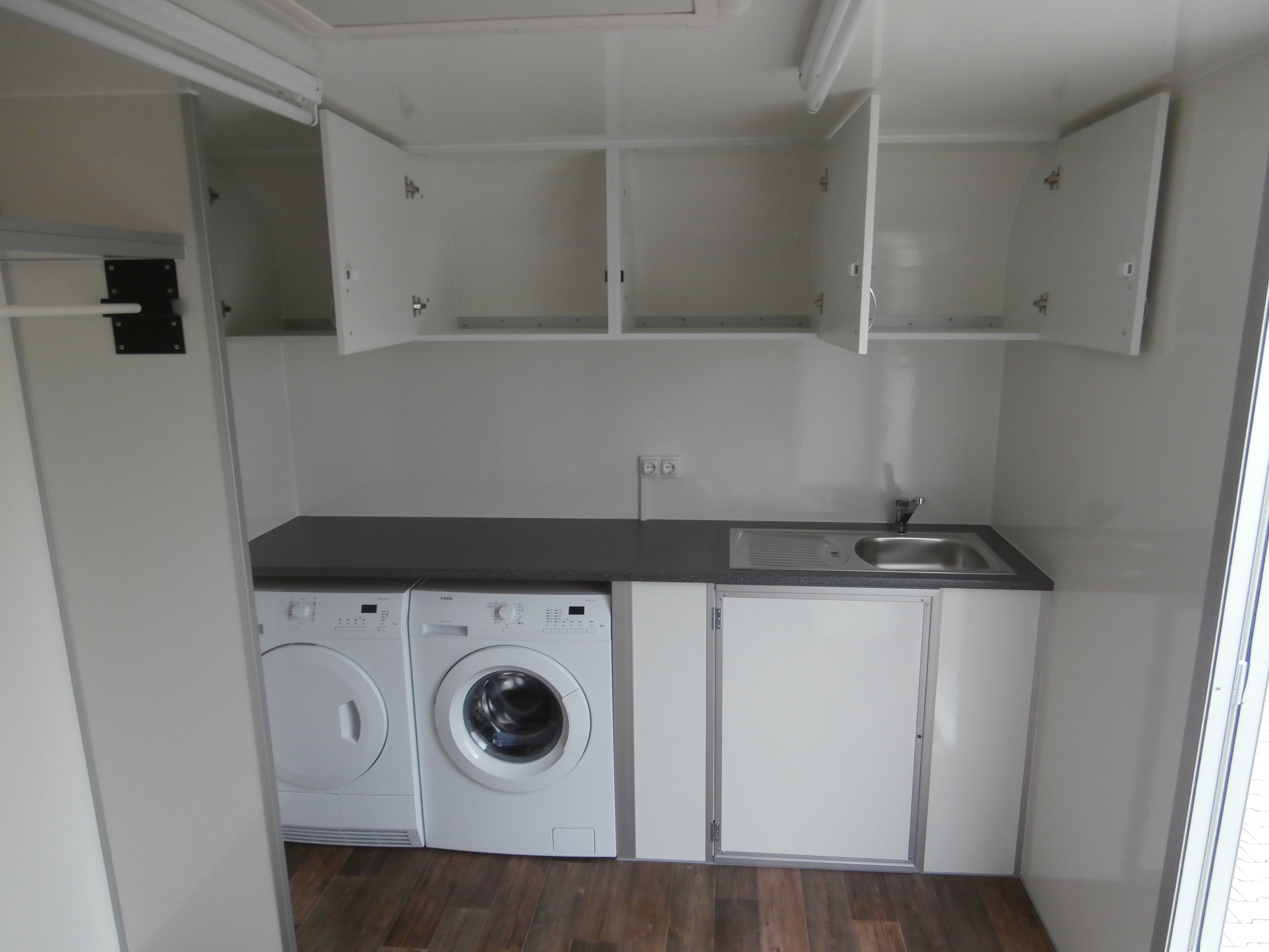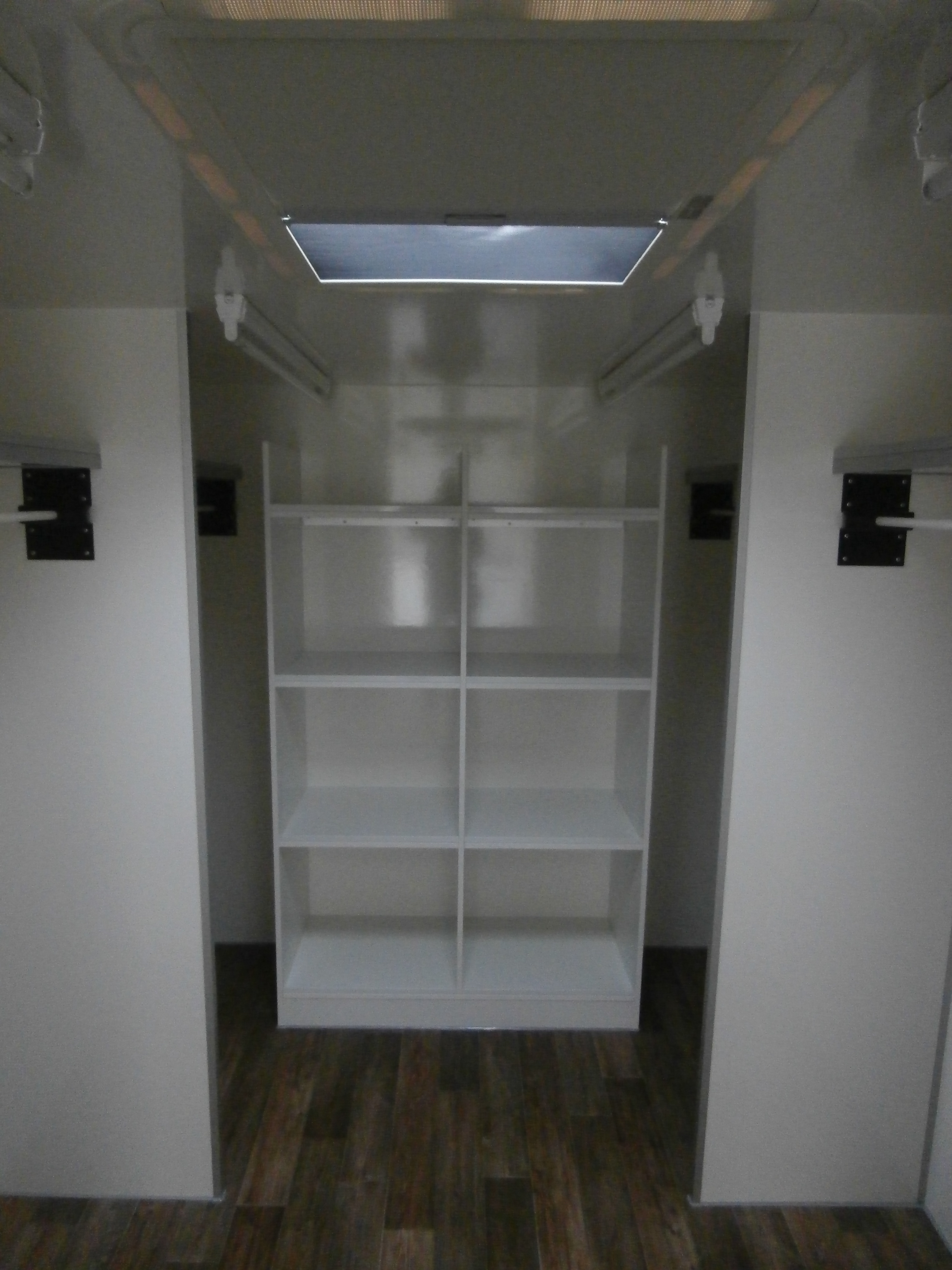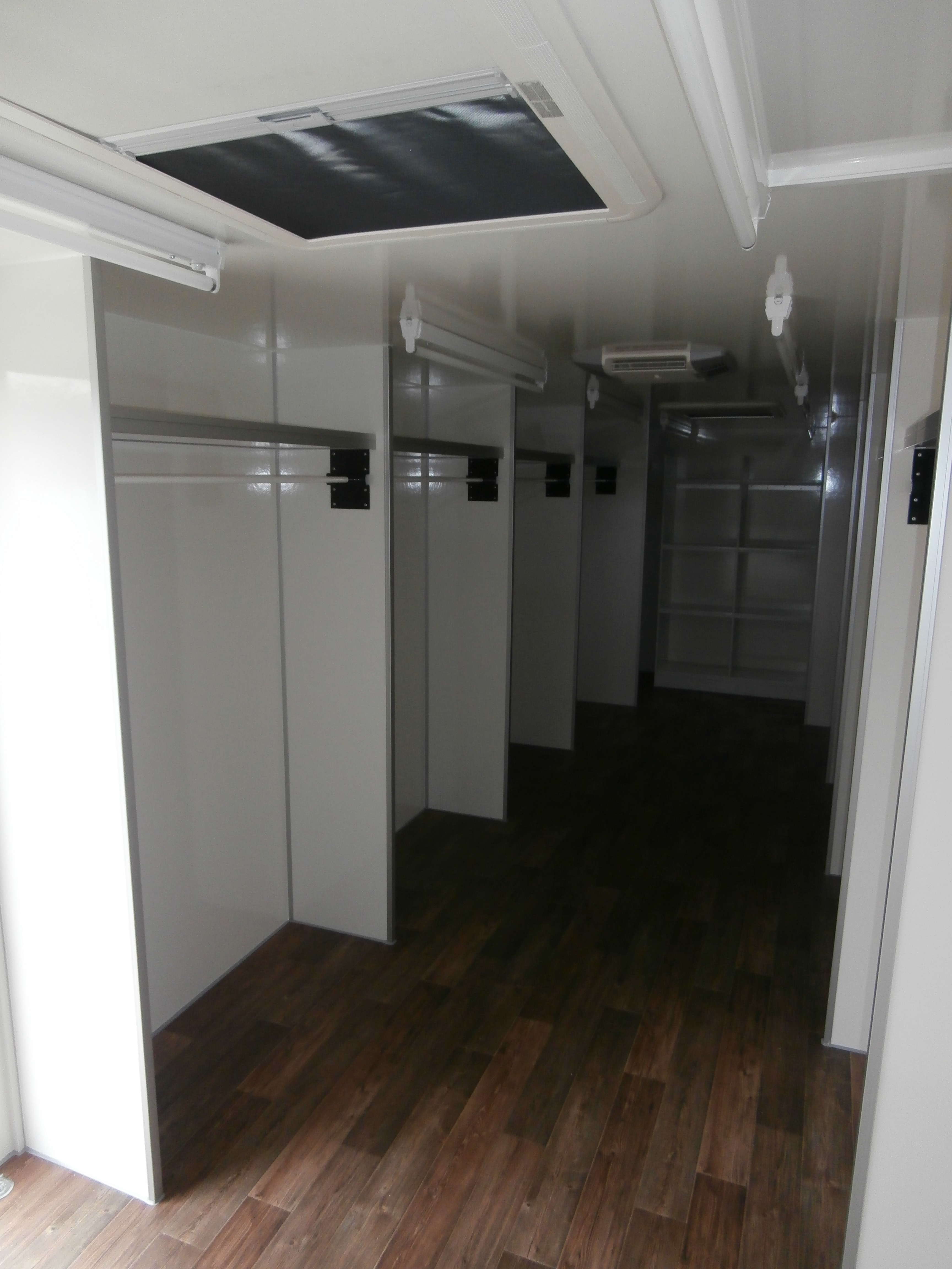 Mobile wardrobe department equipped with wardrobe bars, shelves and kitchen corner. Fresh water (300l) and waste water (100l) tanks.
