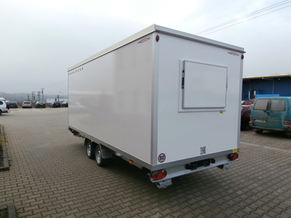 Elektrisch beheizte Wagen für 10-12 Personen, ausgestattet mit Büro/Speiseraum mit Kühlschrank, Regale, Badezimmer mit Tanktoilette, Waschbecken mit Spiegel.