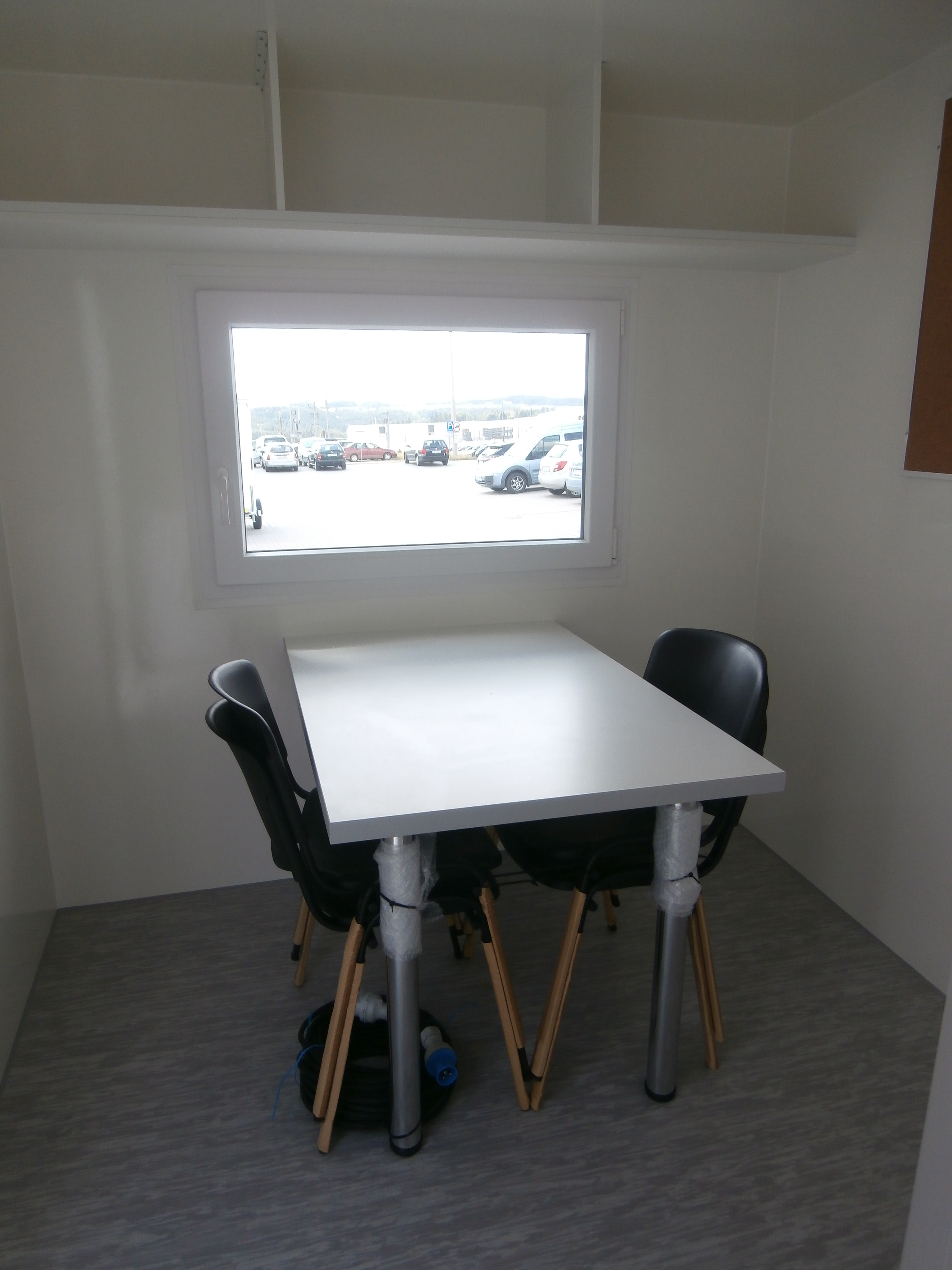 Elektrisch beheizte Wagen für vier Personen, ausgestattet mit Büro/Speiseraum mit Kühlschrank, Badezimmer mit Toilette, Waschbecken mit Spiegel.