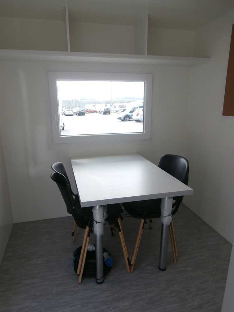Elektrisch beheizte Wagen für vier Personen, ausgestattet mit Büro/Speiseraum mit Kühlschrank, Badezimmer mit Tanktoilette, Waschbecken mit Spiegel.