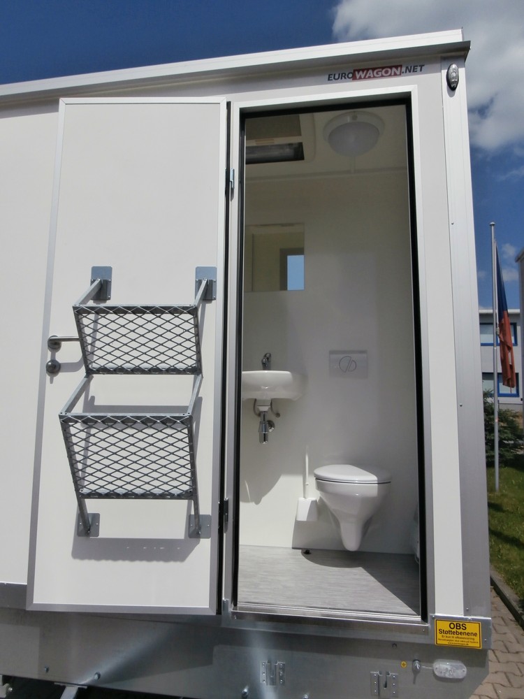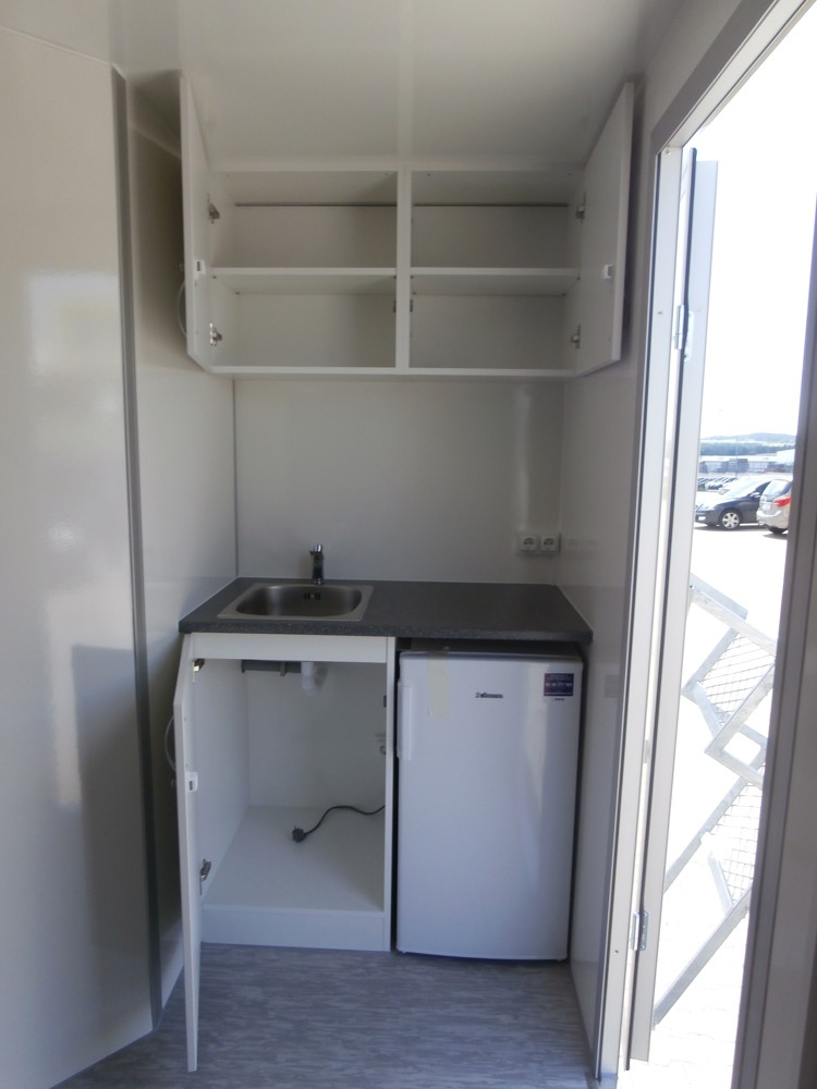 Elektrisch beheizte Wagen für 6-8 Personen, ausgestattet mit Büro/Speiseraum mit Kühlschrank, Spülbecken, Schränke, Regale, Badezimmer mit Toilette, Waschbecken mit Spiegel.