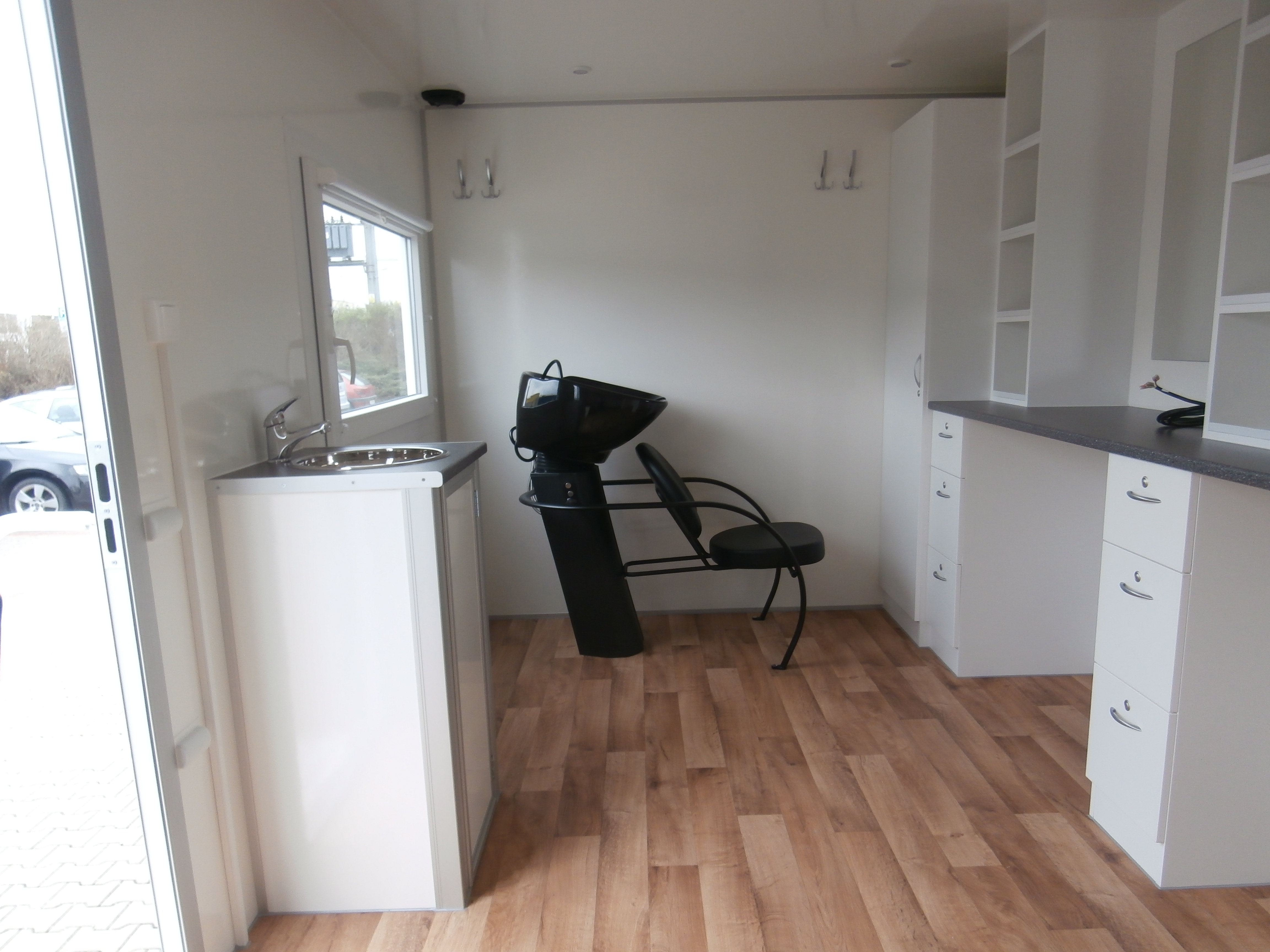 Mobilmasken- und Kostüm- raum mit Maskenpulten, Lagerplätzen, Regalen, Schubladen, Friseursessel …
