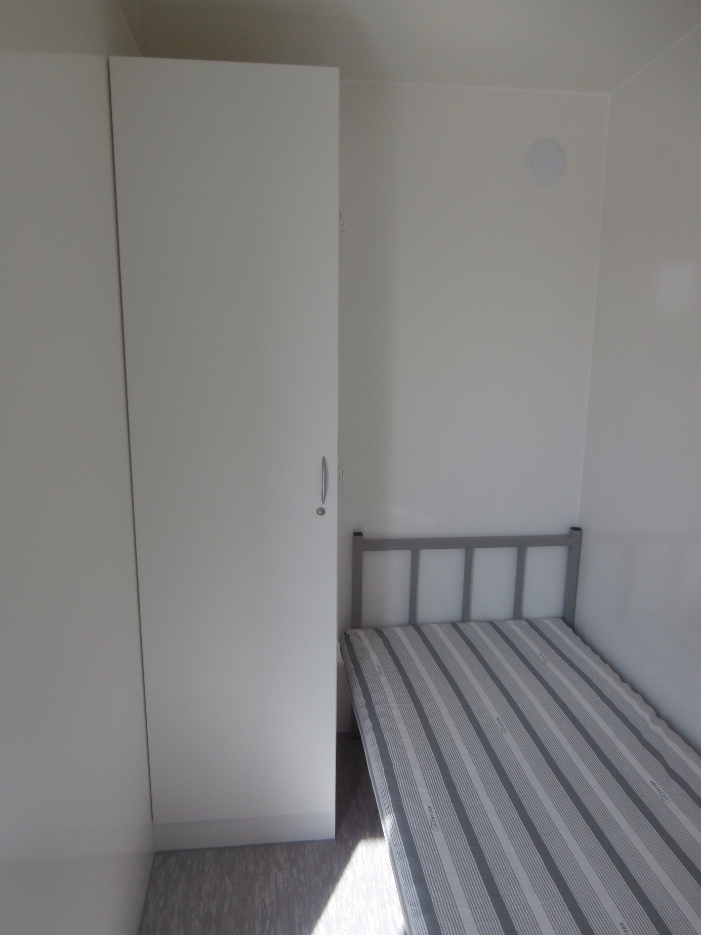 Elektrisch beheizte Wohnwagen für drei Personen, ausgestattet mit Küchenzeile (Geschirrspülmaschine, Abzugshaube, Kochplatte, Kühlschrank, Kaffeemaschine, 19" Fernseher), 3 x Schlafzimmer mit Einzelbetten, Badezimmer mit Toilette, Dusche und Waschbecken mit Spiegel.