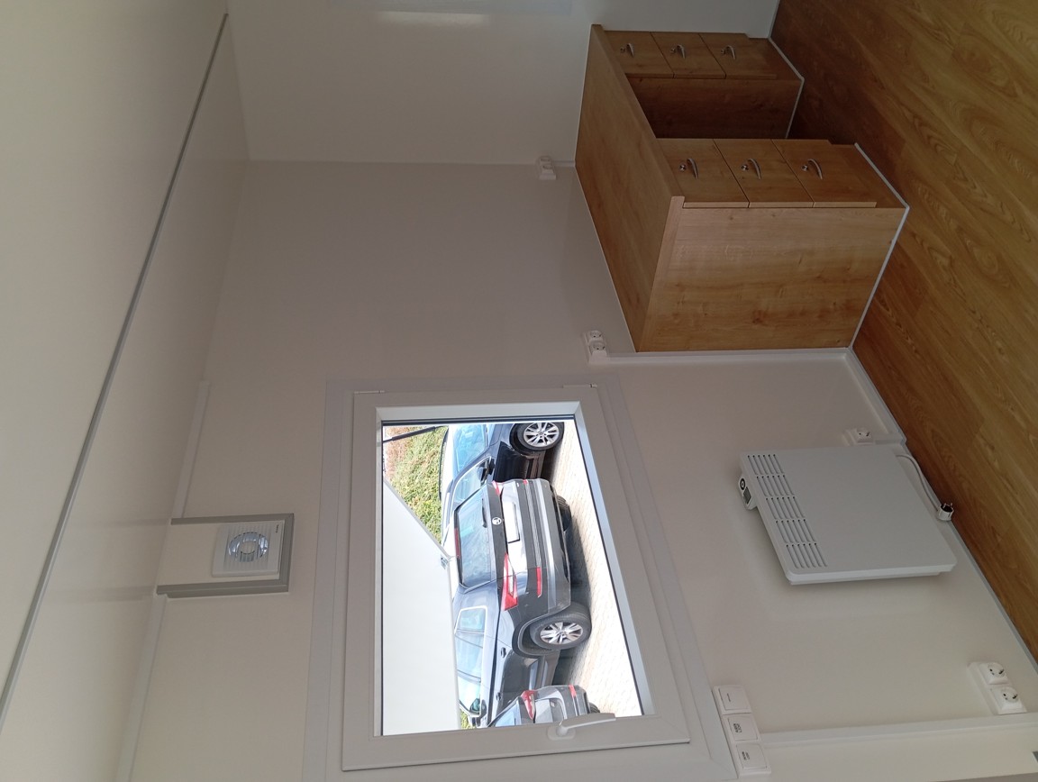 | Roof | 60 mm sandwichpanel med 1,5 mm glasfiber på hver side og en kerne af 57 mm PUR skum |