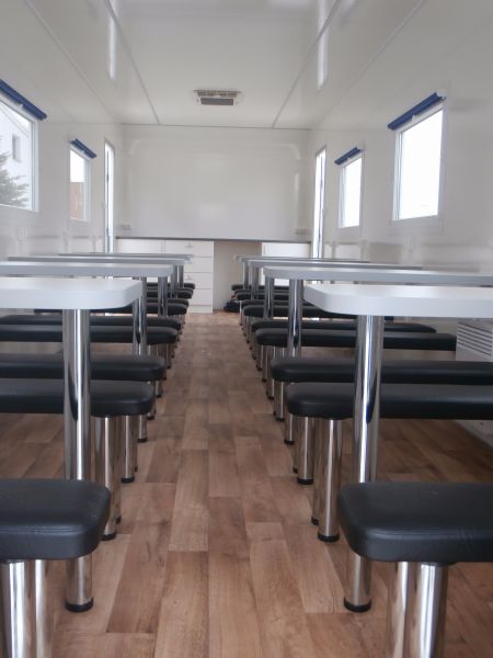 - Udstyr indvendig: Kaffeborde, polstrede siddepladser, klimaanlæg, rullegardiner og strøm ved hvert bord, hvor der kan laves kaffe