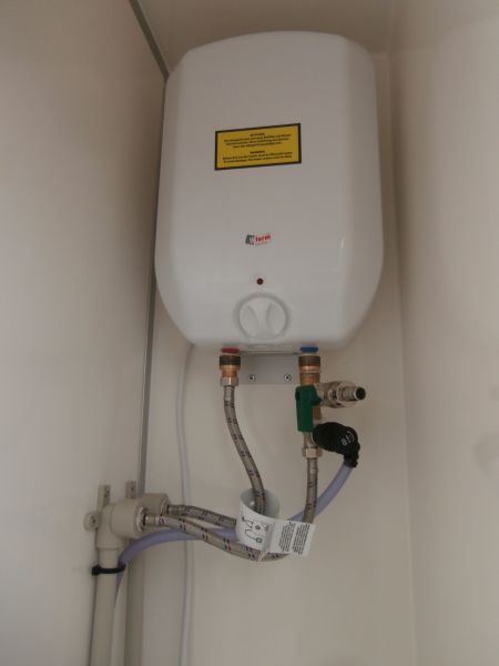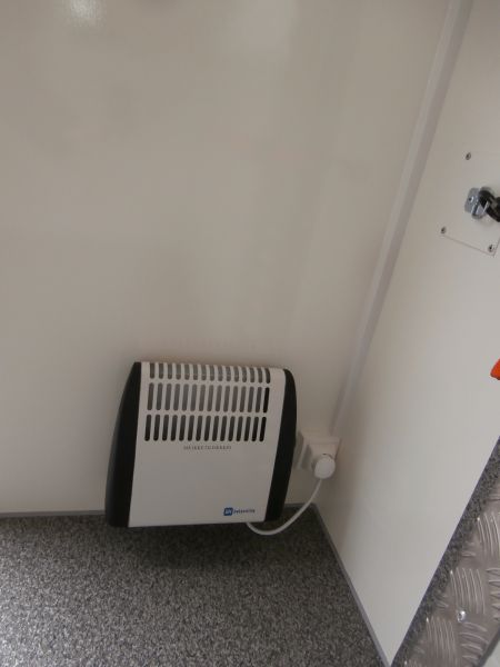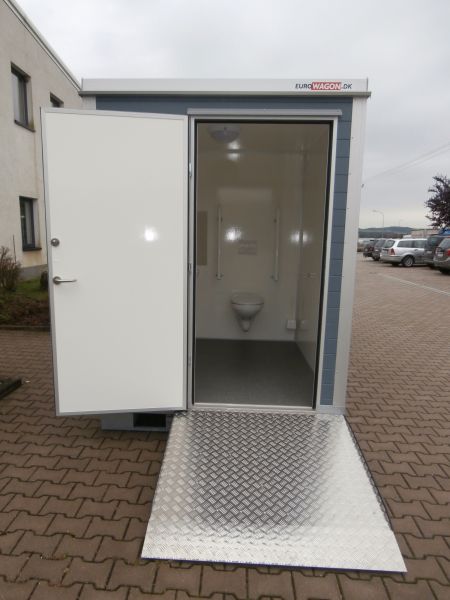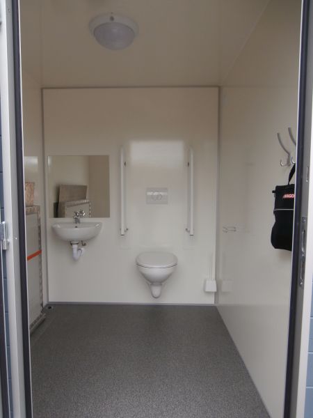 Záchod s umyvadlem, topením přizpůsobený i pro vozíčkáře.