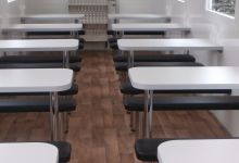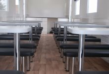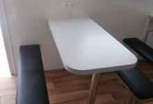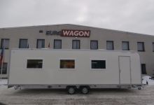 Mobile-Café with modern interior design and big number of places for sitting. The inner equippment includes: coffee tables, upholstered seats, air-conditioner, roller blinds, power points at each table and base for preparing the coffee.