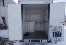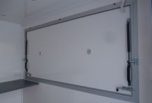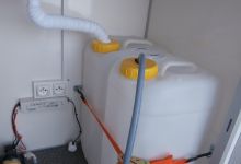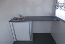 Equipped with kitchen corner - water system with 2 watercans (for fresh and waste water) connected to 12V water pump. Electric connection 230V-16A.
