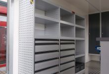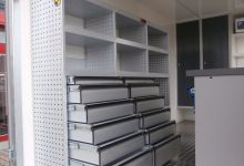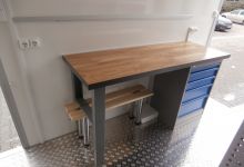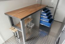 The trailer is equipped with working board, drawers for tool, cupboards and microwave oven.