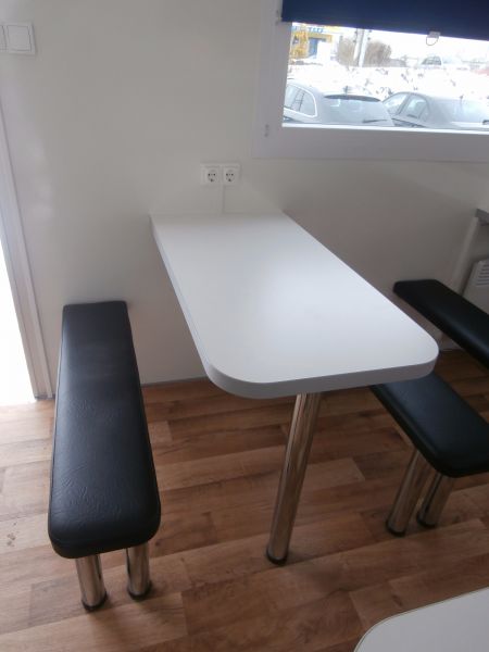 Mobile-Café with modern interior design and big number of places for sitting. The inner equippment includes: coffee tables, upholstered seats, air-conditioner, roller blinds, power points at each table and base for preparing the coffee.