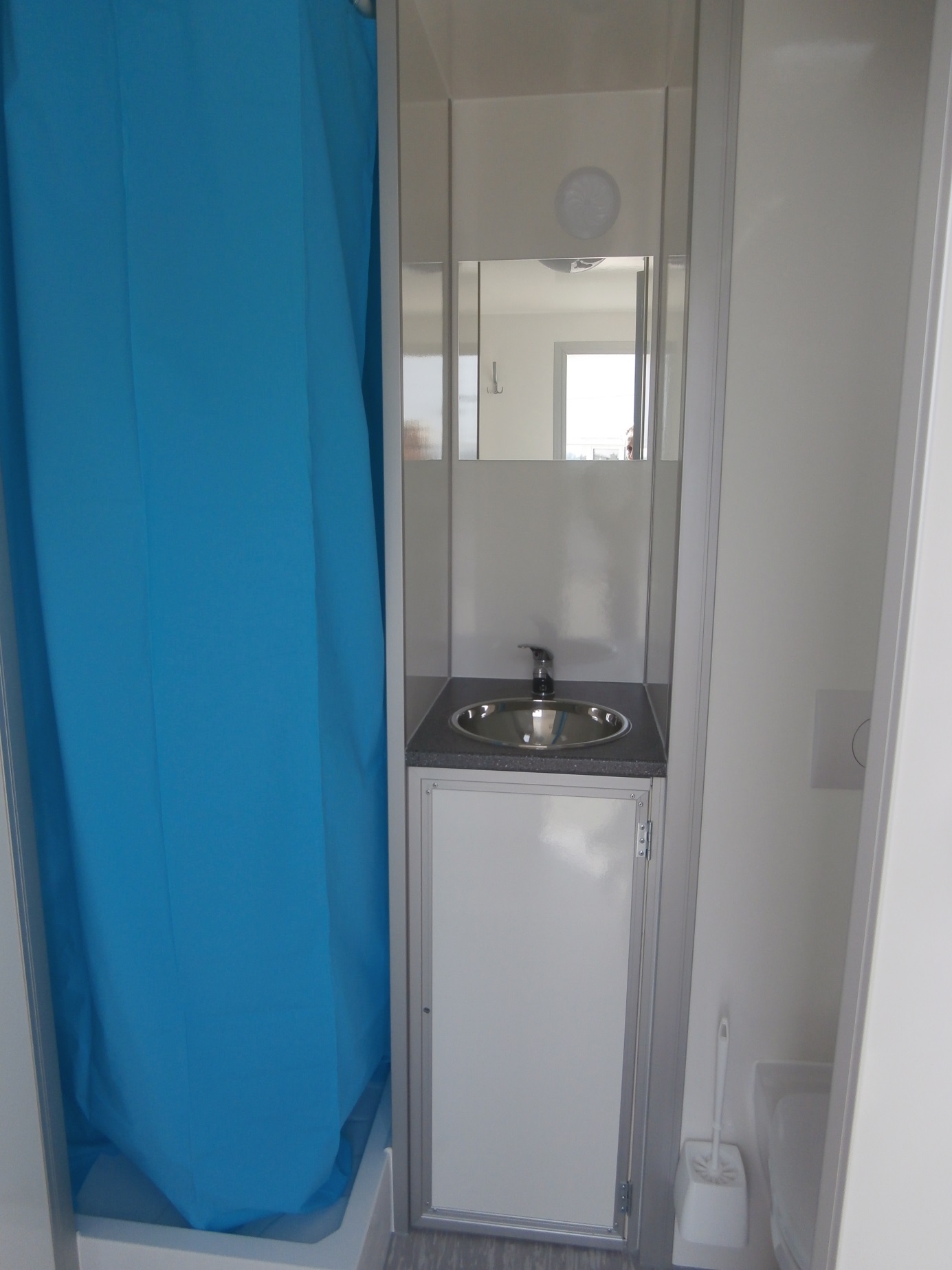 Accommodation trailer for 3 people, electrically heated mobile unit – equipped kitchen with accessories (dishwasher, cooker hood, electric cooker, fridge, coffee maker, TV 19"), 2 separate bedrooms with bunk beds, bathroom with toilet, shower and wash basin including a mirror.