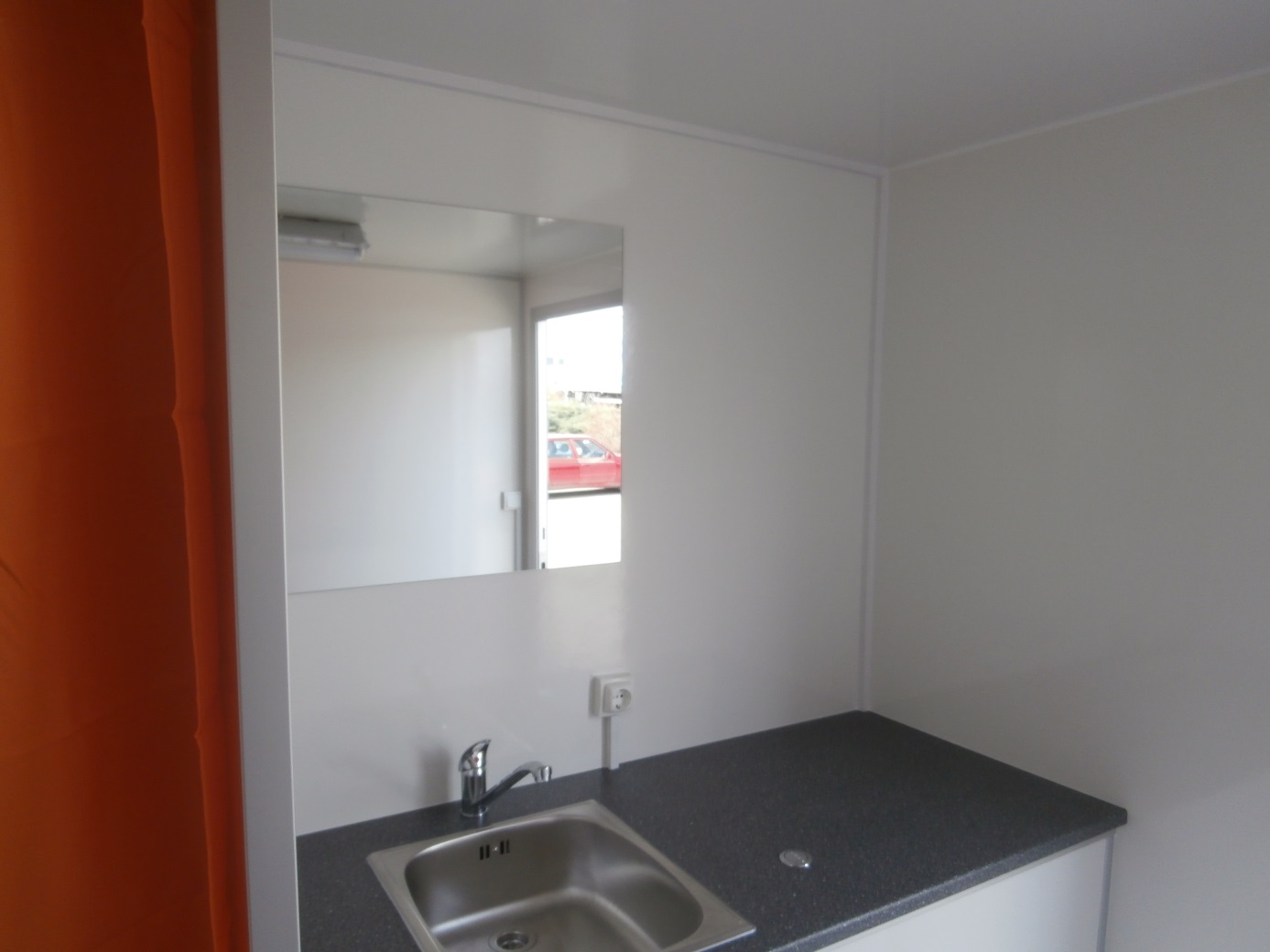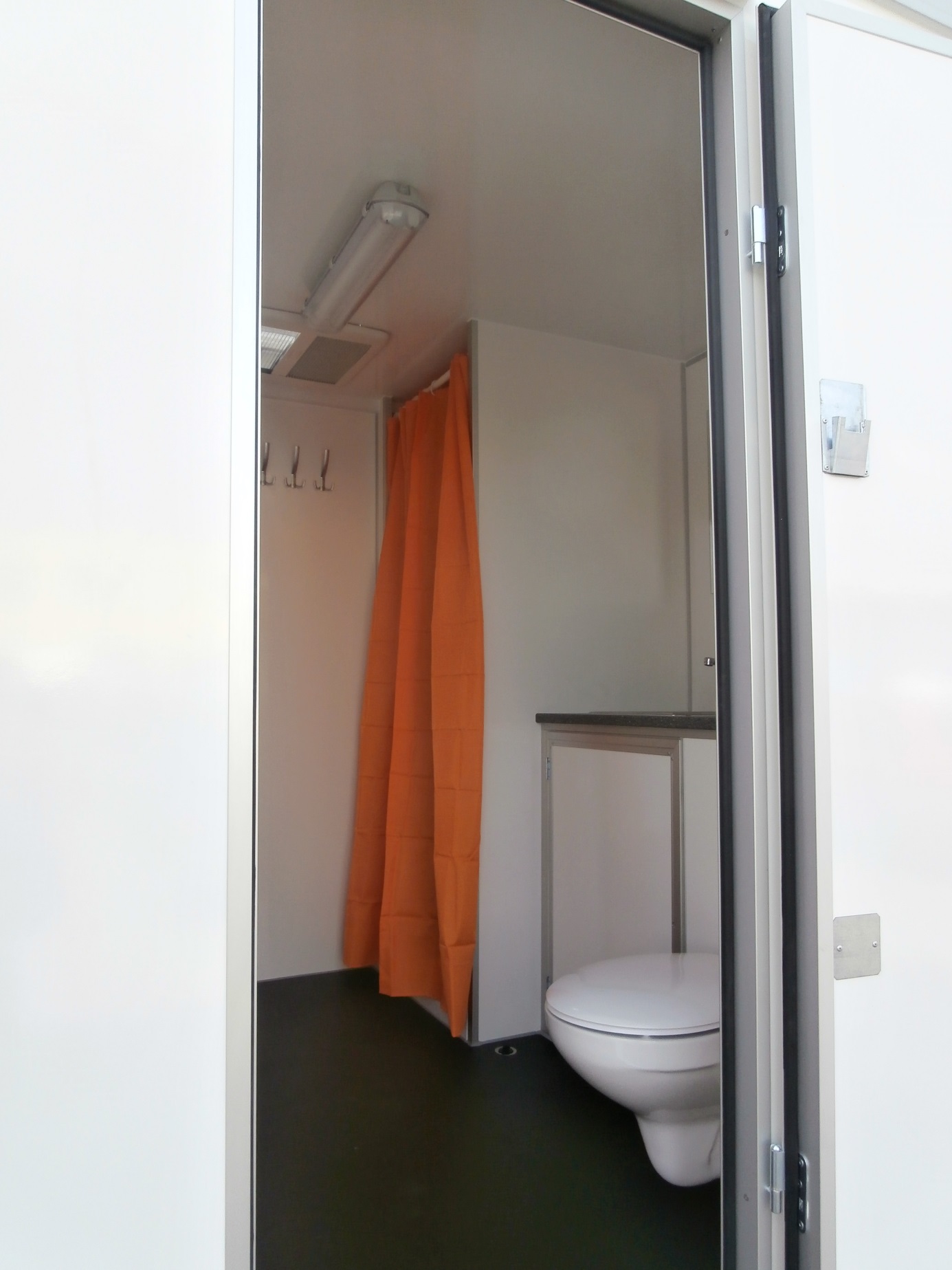 Three mobile bathrooms, electrically heated, equipped with toilets, showers, wash basins including mirrors.