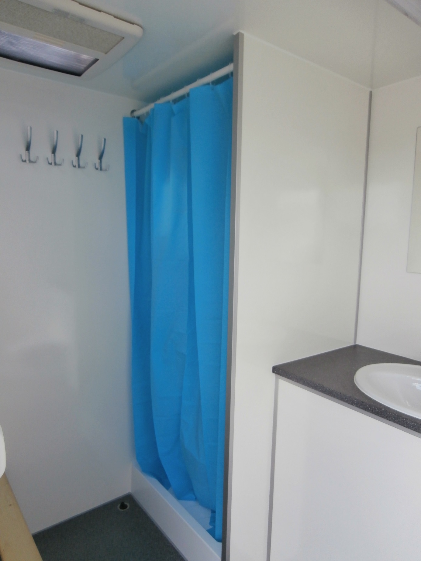 Mobile bathroom electrically heated with toilet, shower, wash basin including mirror and cupboard.