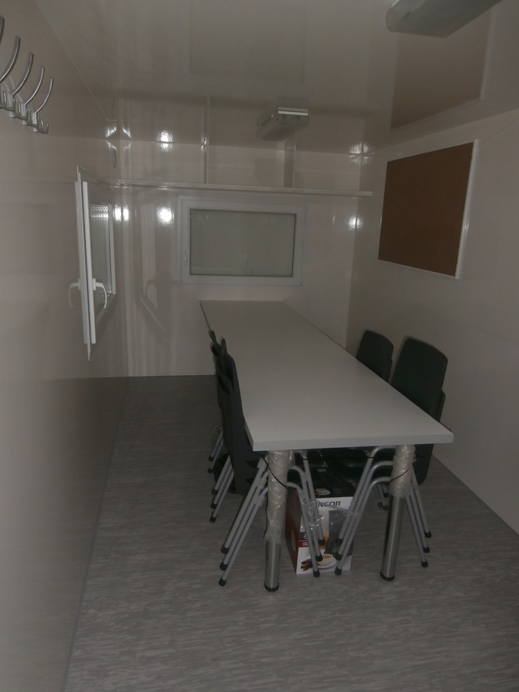 Mobile unit for 10-12 people – electrically heated office/dining room – equipped with fridge, toilet and wash basin including mirror.