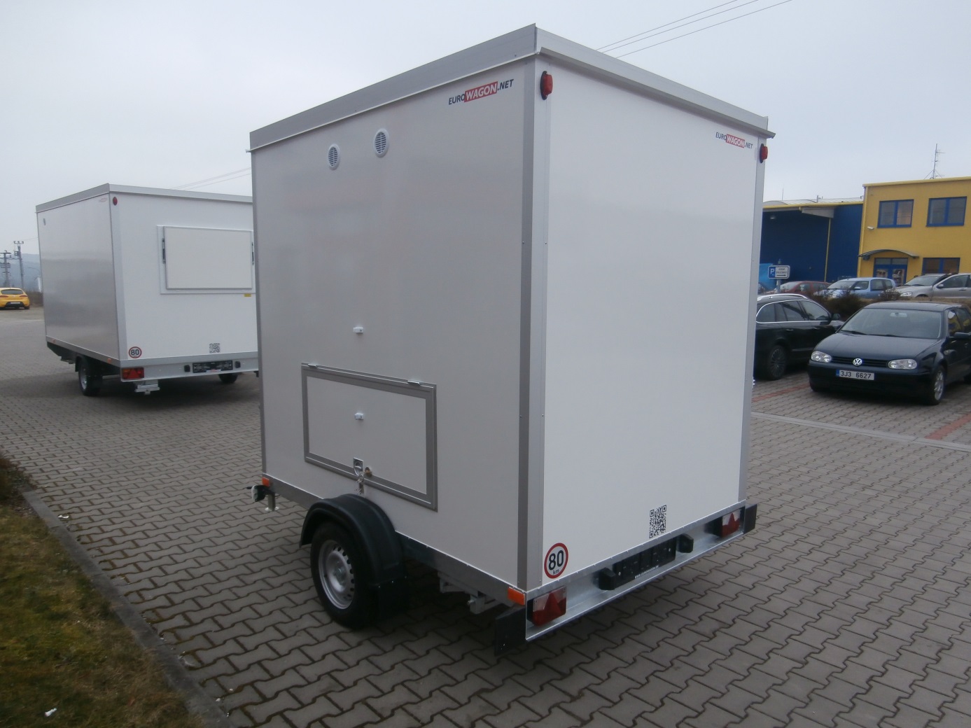 Sanitary toilet trailer, electrically heated – equipped with two separate toilets, wash basins including mirrors.