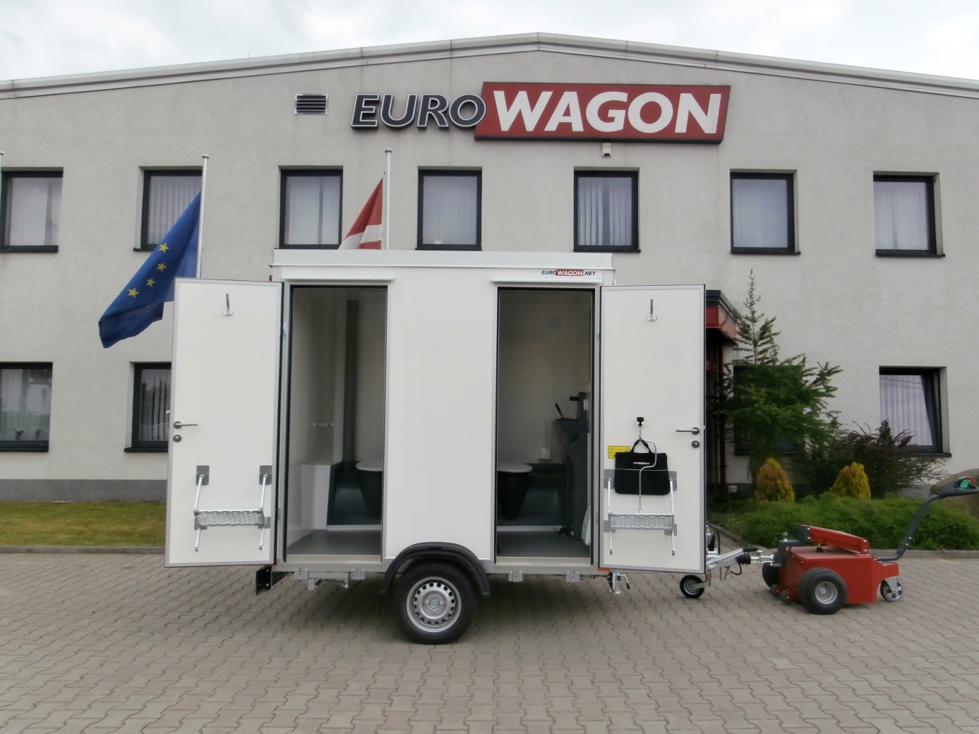 Sanitary toilet trailer, electrically heated – equipped with two separate tank toilets, wash basins with foot pump including mirrors.