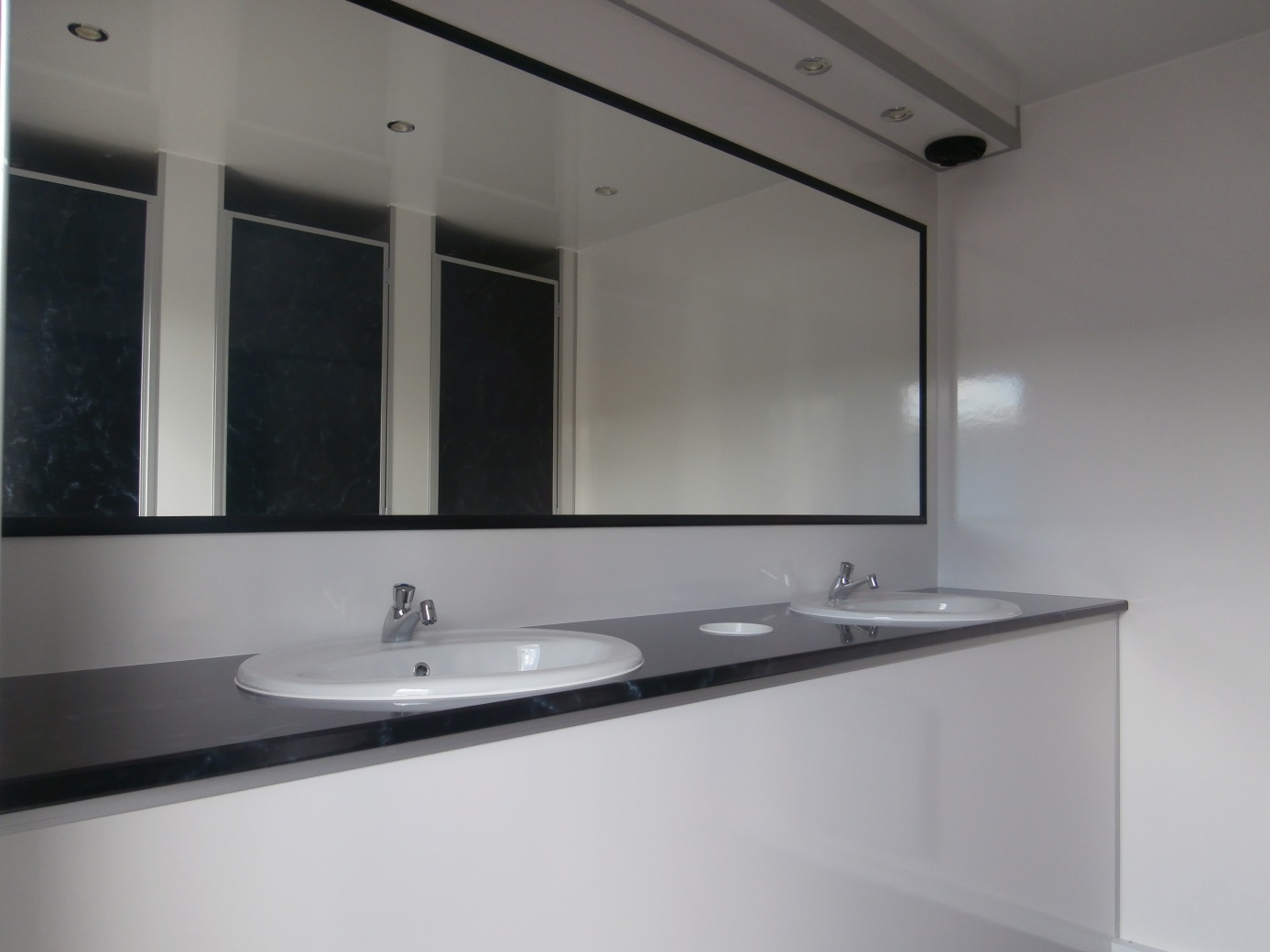 Sanitary toilet trailer, electrically heated – equipped with 3 women´s toilets, one men´s toilet and 5 urinals, also with wash basins including mirrors.